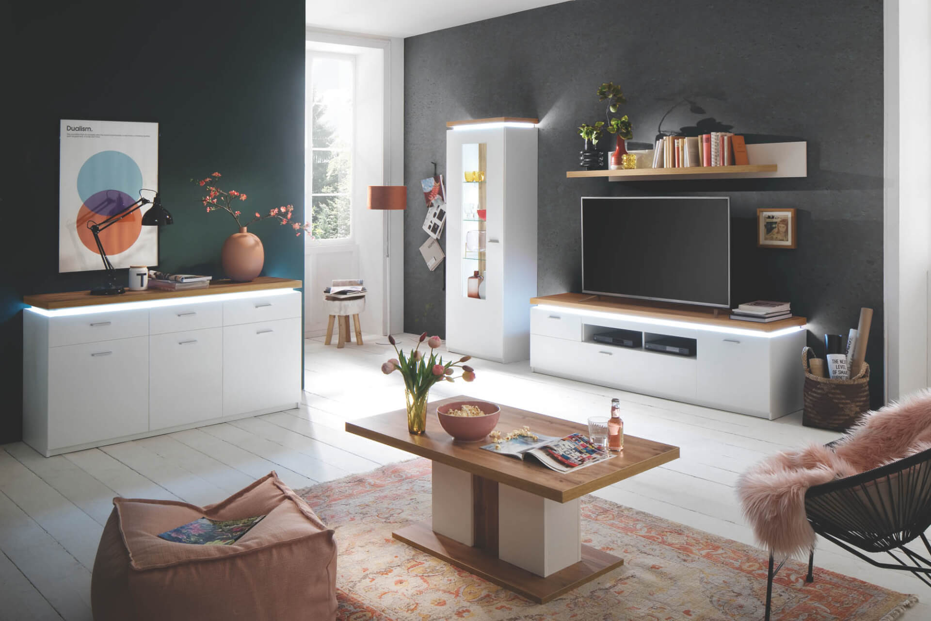Wunderschönes Wohn & Esszimmerprogramm mit Front und Korpus in weiß Melamin Nachbildung und Absetzungen in Wotan Eiche Melamin Nachbildung. Die sichtbaren Rückwände sind in Wotan Eiche Nachbildung gestaltet. Rückwände hinter Türen & Schubkästen in weiß Nachbildung. Frontglas & Glasböden in Klarglas und Griffe in Metall. Die Schubkästen sind mit Unterflurführung gedämpft und optional können Sie die Rückwandbeleuchtung ergänzen. Beachten sie unseren Typenplan!Produktübersicht