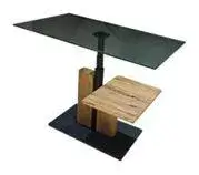 DELMAS, ein Couchtisch mit Top Glasplatte grau, rechteckig und mit Lift schwarz, pulverbeschichtetem Block in Eiche massiv, geölt. Die  Ablageplatte ist in Eiche natur, geölt und die Bodenplatte aus MDF schwarz