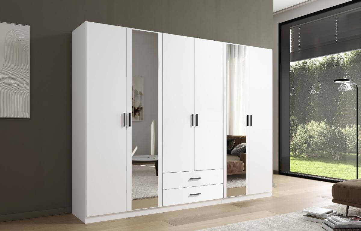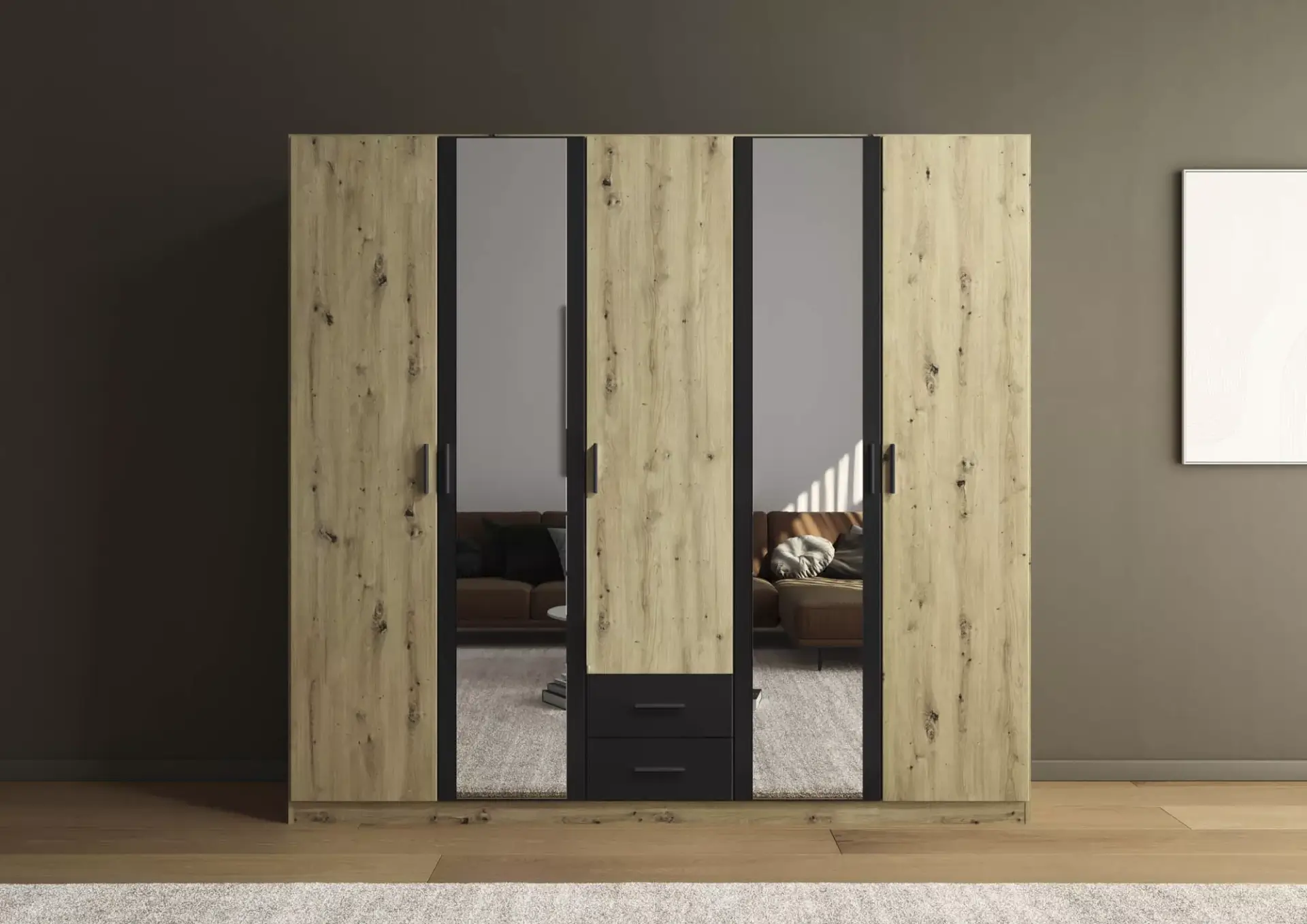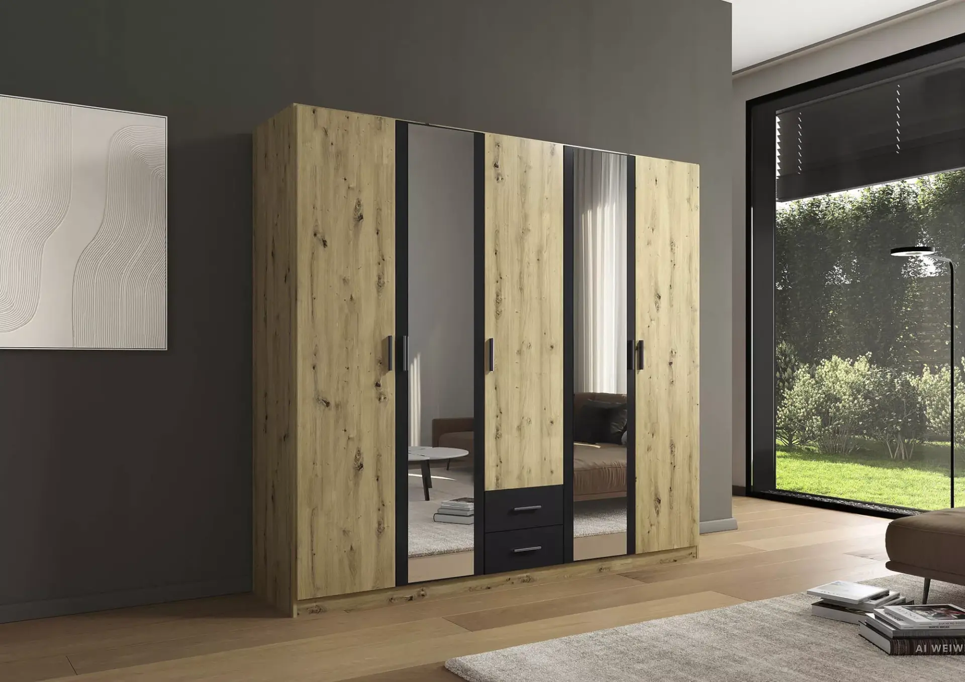 Drehtürenschrank mit Front in Front grau-metallic, Korpus Eiche Artisan Nachbildung. Optional komplett in alpinweiß.