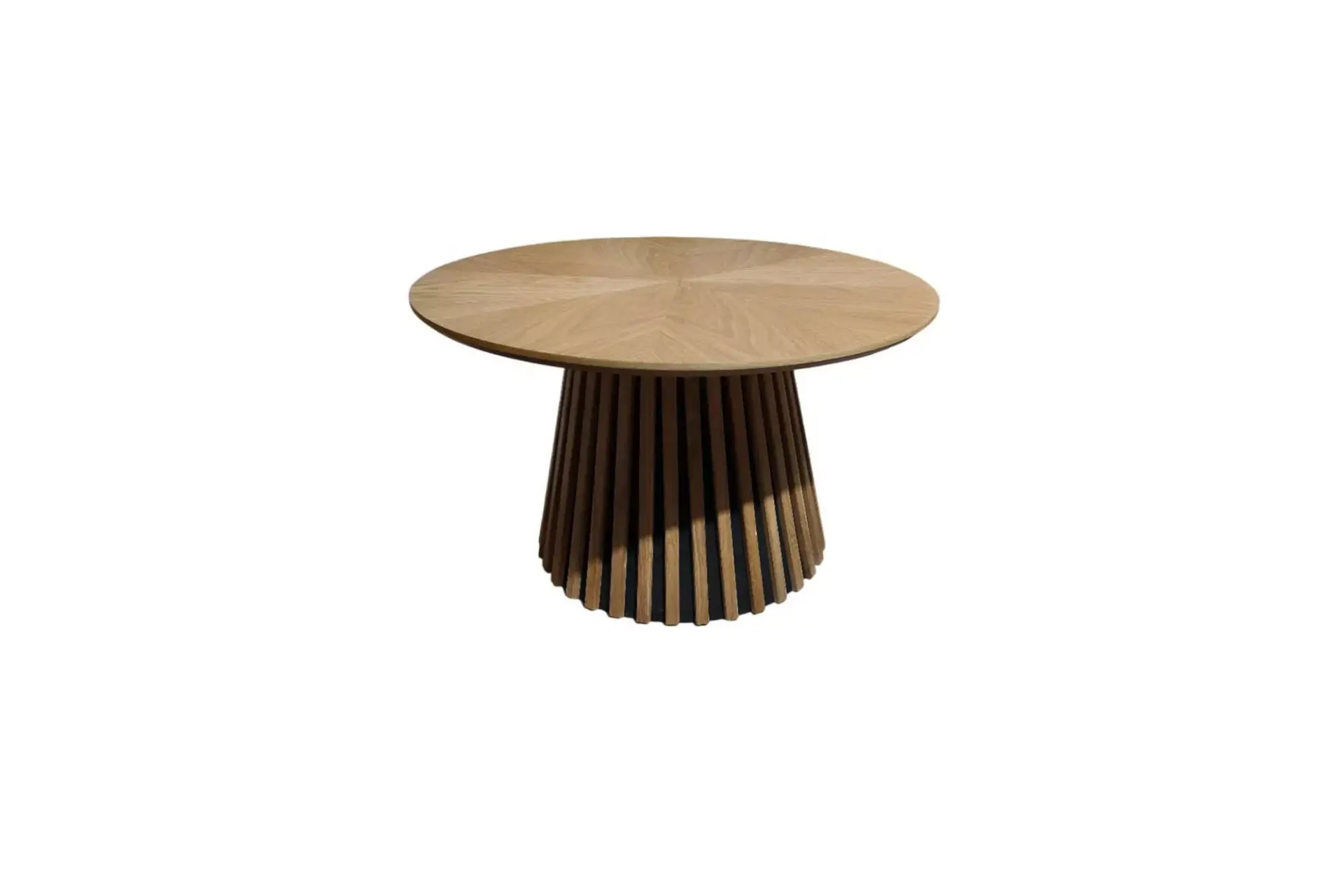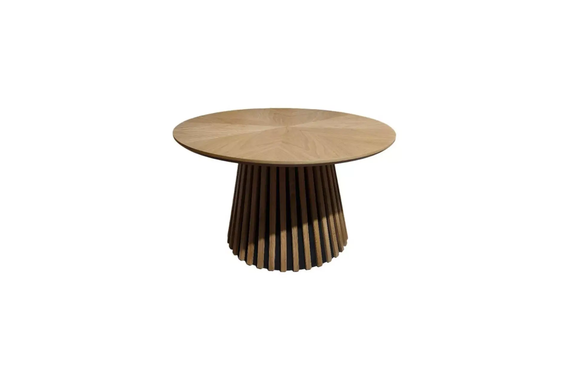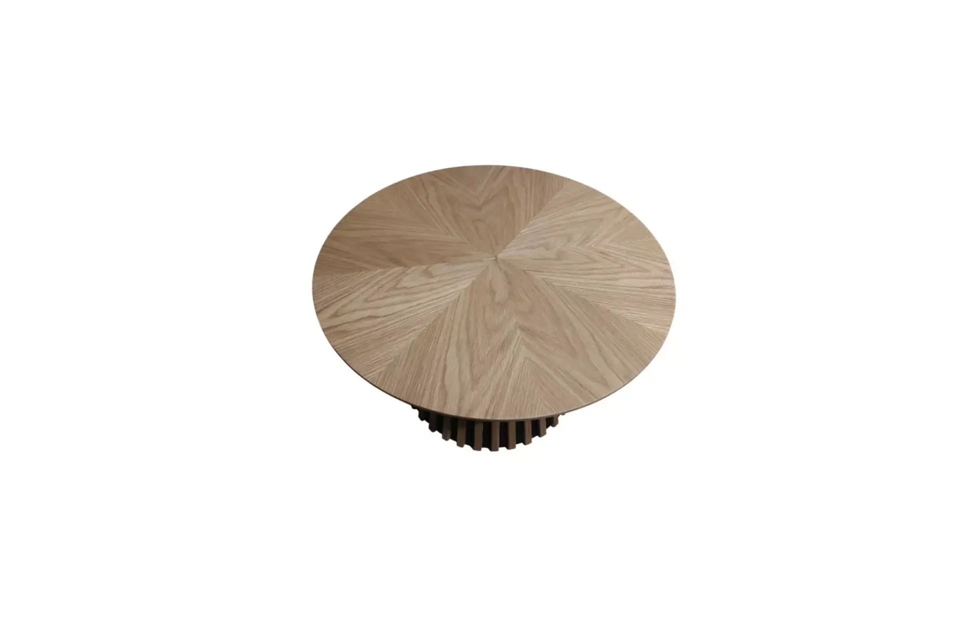 Karachi Couchtisch rund, in Eiche furniert und natur lackiert. Gestell innen MDF und Pinie , massive Eichelatten natur lackiert.