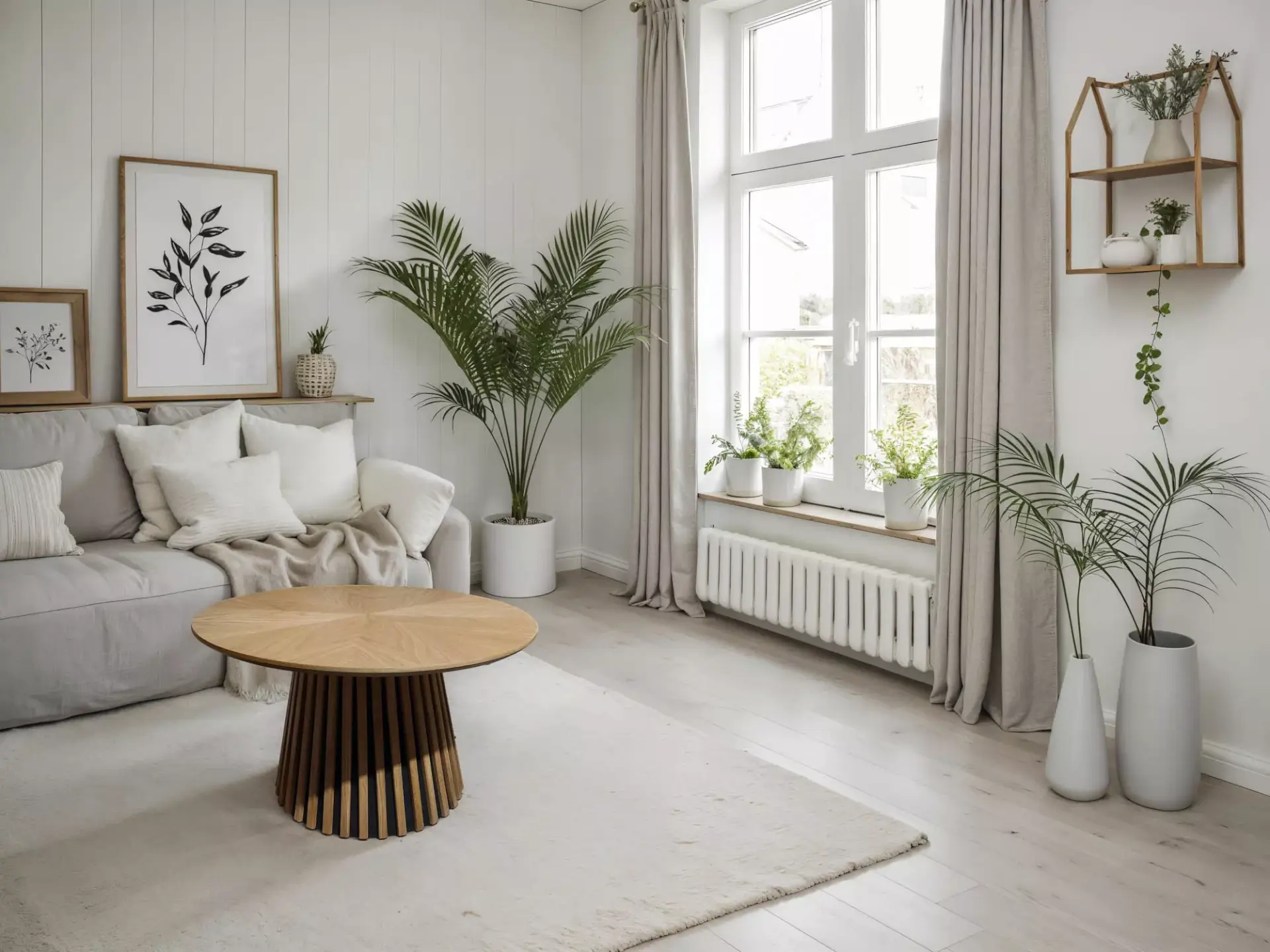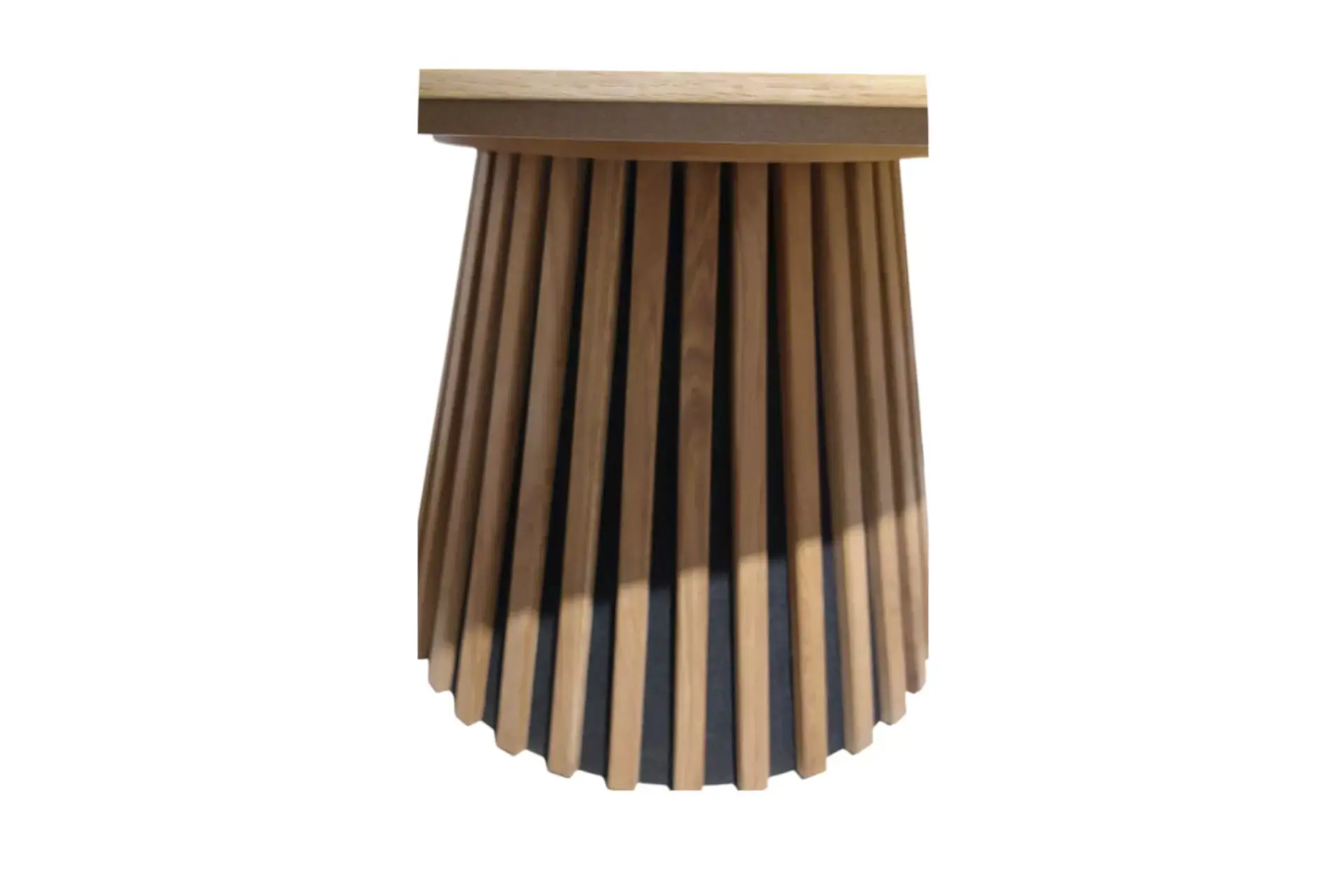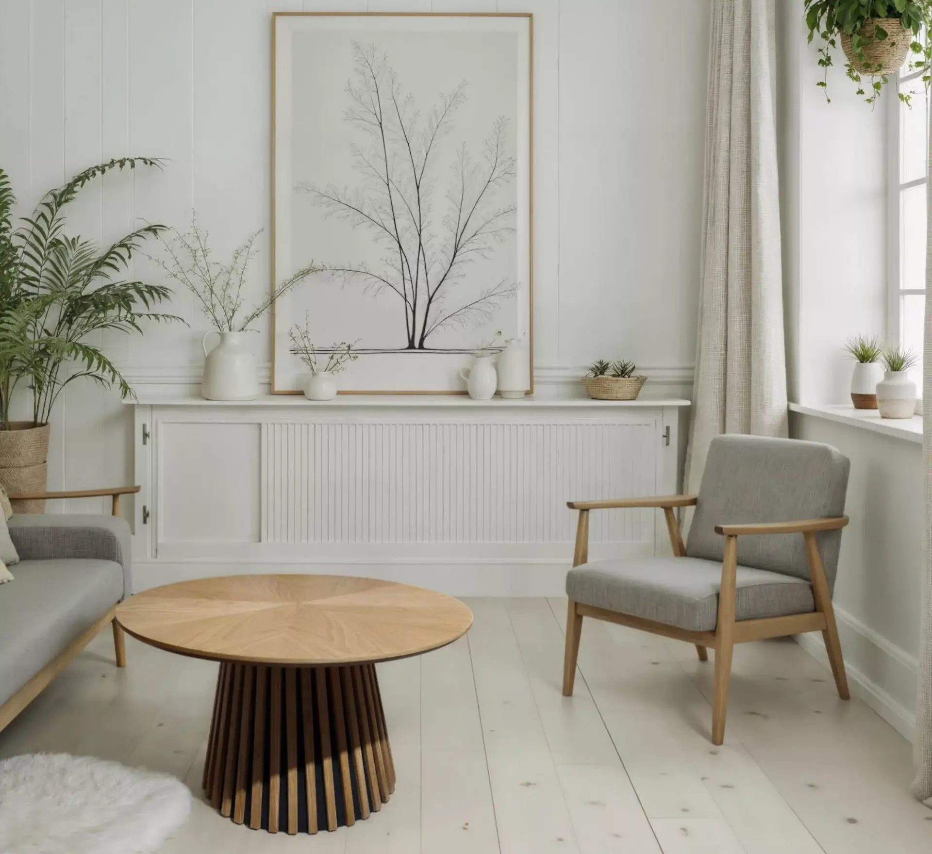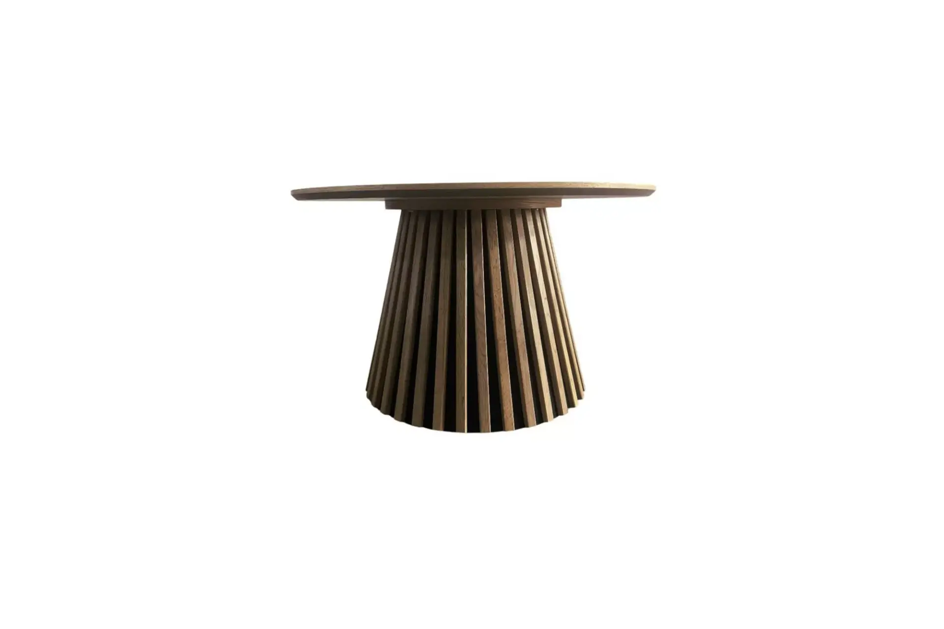 Karachi Couchtisch rund, in Eiche furniert und natur lackiert. Gestell innen MDF und Pinie , massive Eichelatten natur lackiert.