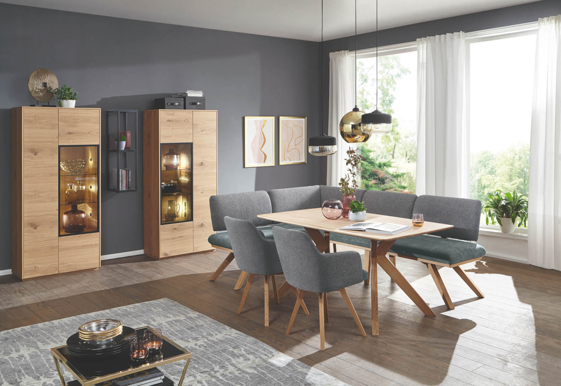 5-teilige Eckbankgruppe in Wildeiche Samtöl bestehend aus:- Eckbank, Sitz gepolstert, Lehne Variante 2 (kurz), Bezug: Sitz Amour 5513 mint, Lene Forza 5510 mint. Außenseite: Cat 11 (Füße schräg) links 165 x rechts 235 cm