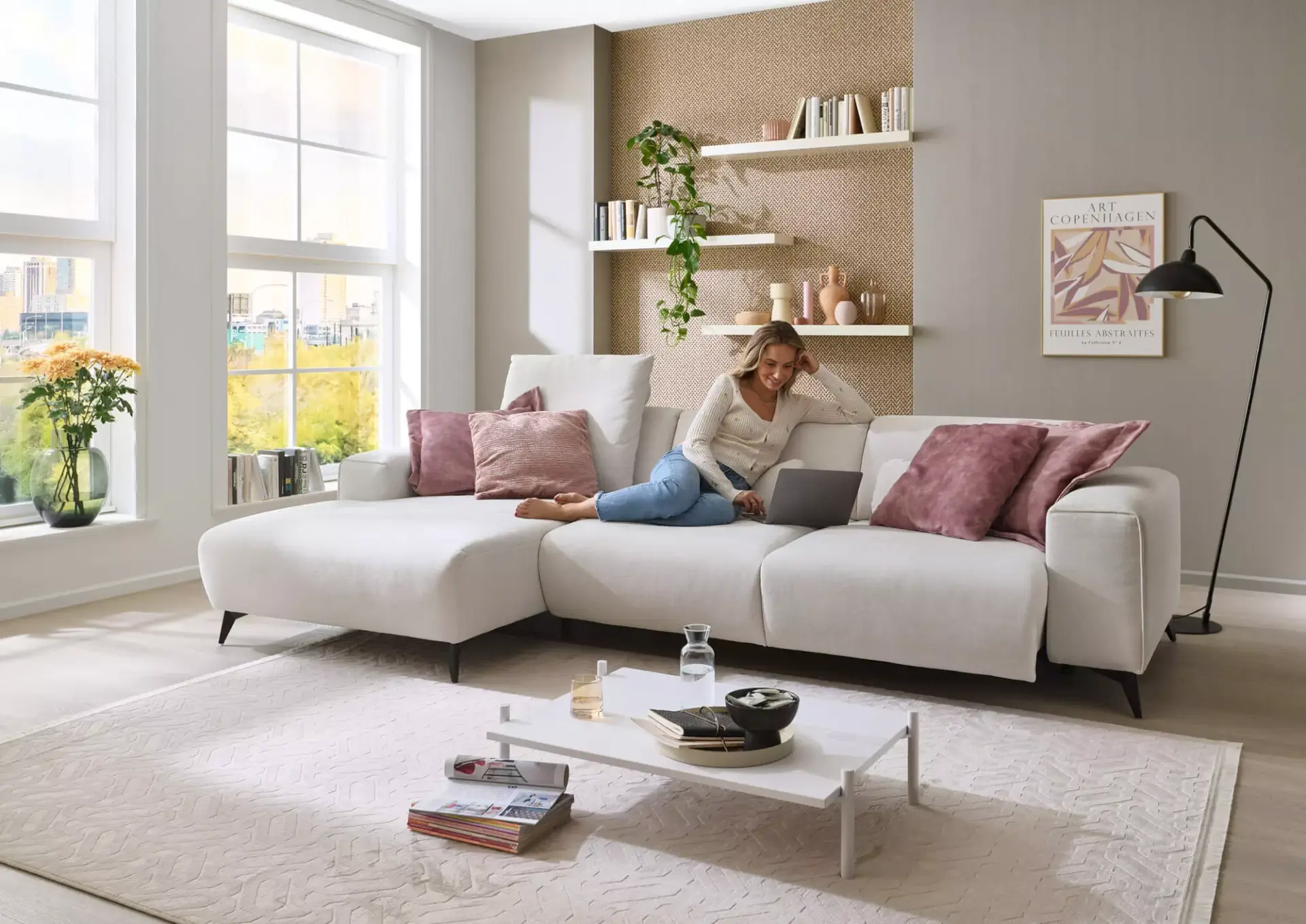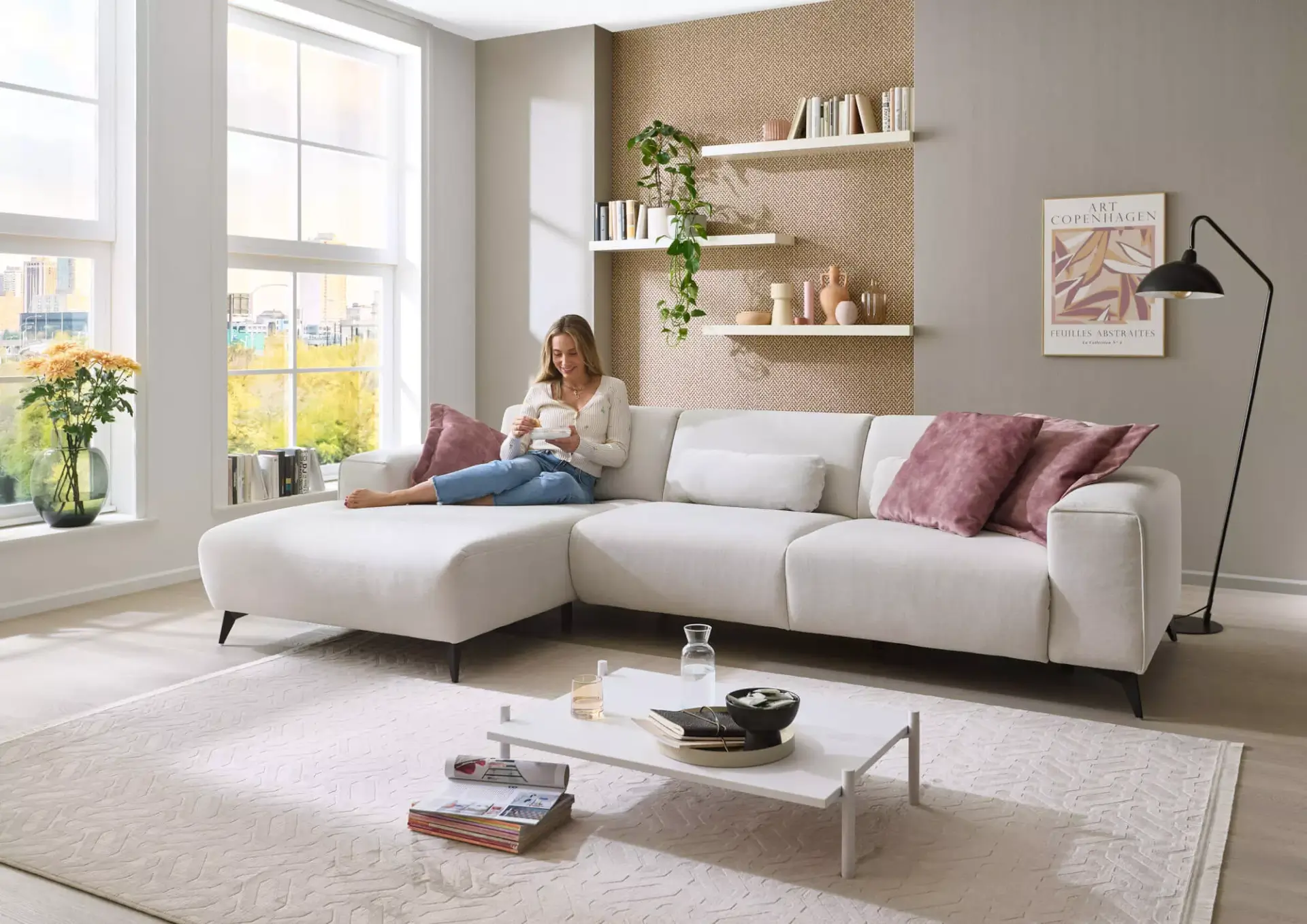 Styliches Polsterprogramm mit zwei Sitzqualitäten, einer großen Typenauswahl, zwei Fußvarianten und optional eine motorische Vorziehbank, die sich bis ca. 19 cm nach vorne ausziehen lässt.