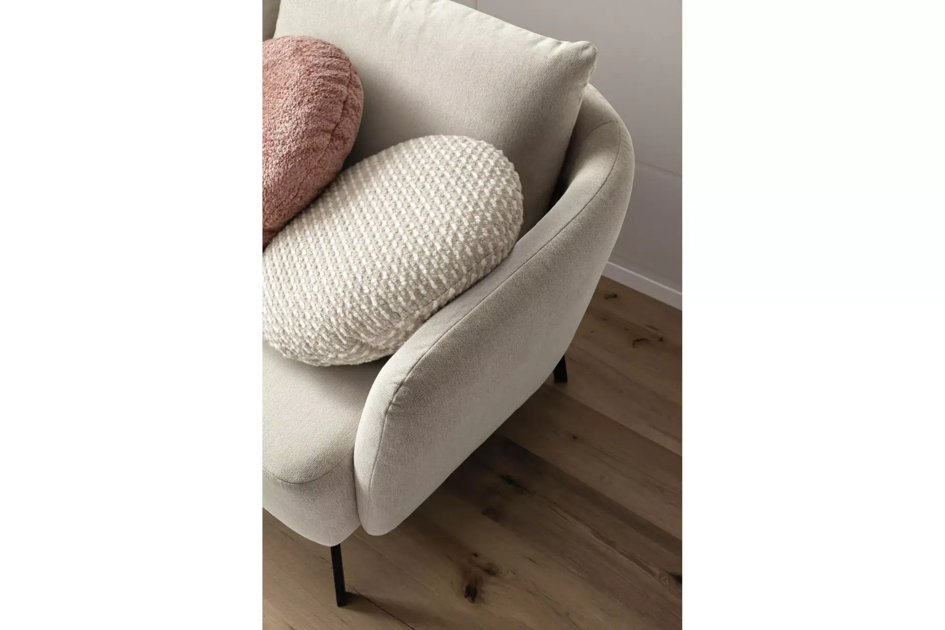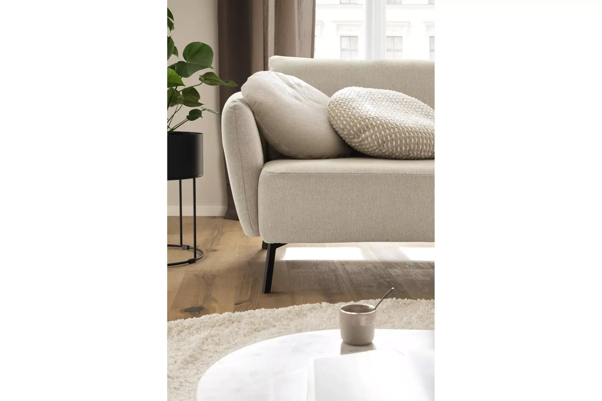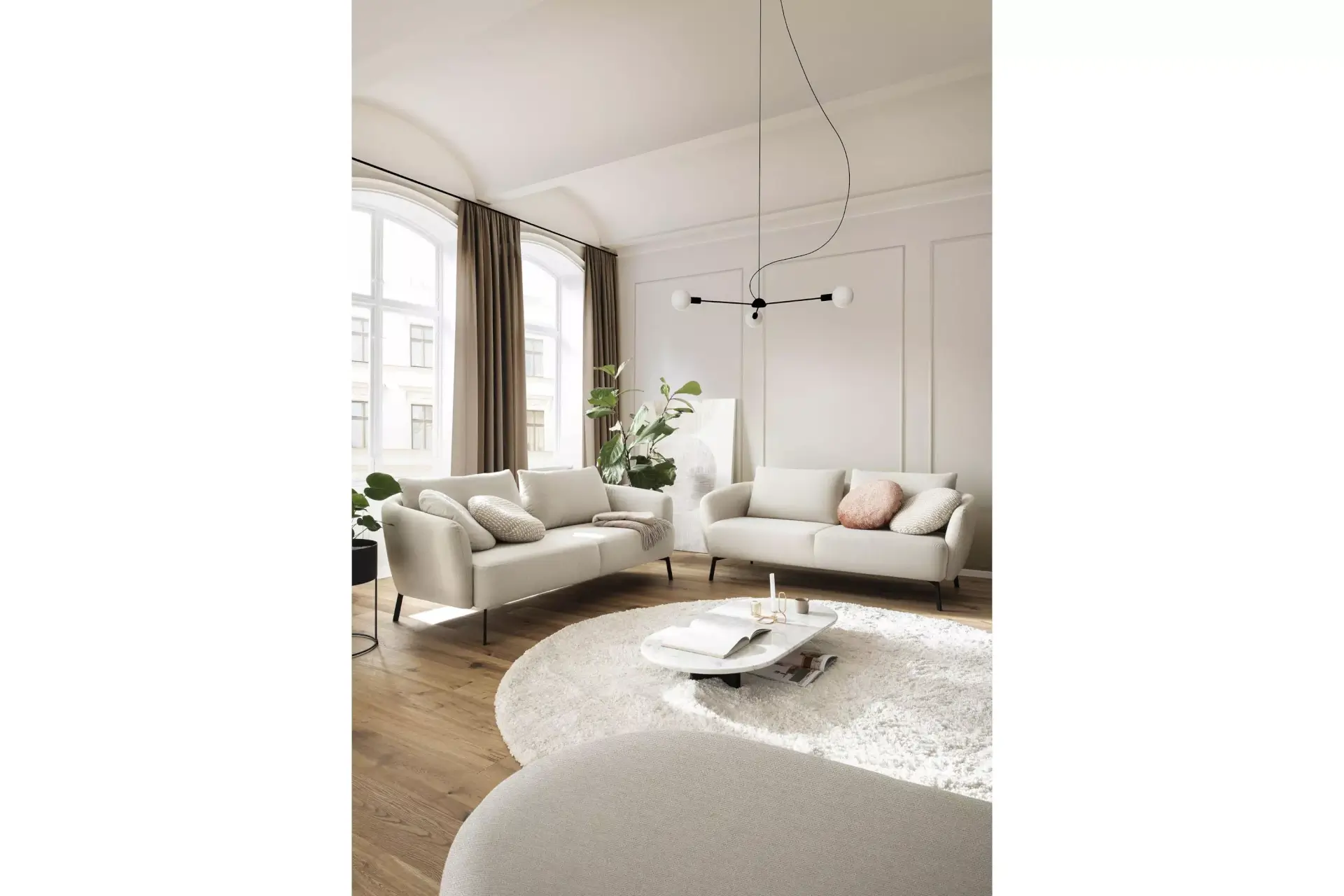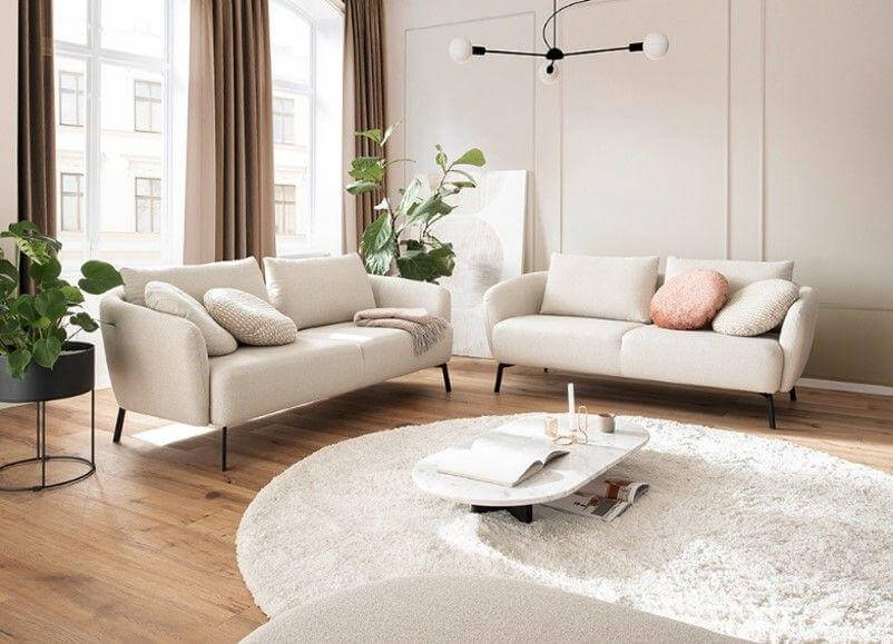 Neela, eine Polstergarnitur mit harmonisch weichen Konturen. Sie hat einen weichen, lockeren Polsteraufbau, bei dem die Wellenbildung modellbedingt gewünscht ist.