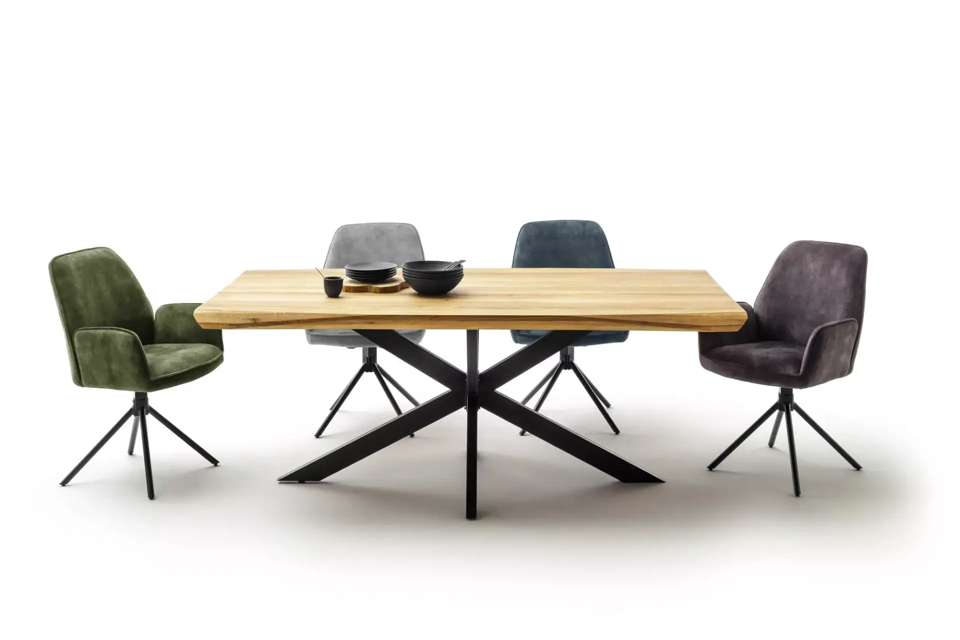 Stylischer Retro-Polsterstuhl mit Drehfunktion in verschiedenen Bezugsstoffen.