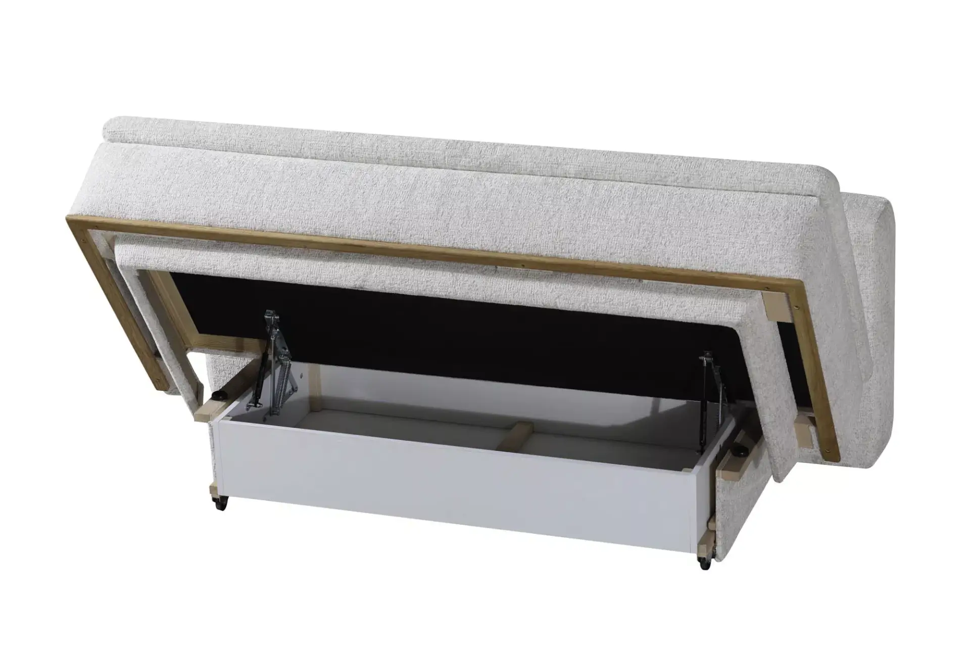 Querschläfer mit Bettkasten und einem Federkernsitz bei einer Liegefläche von 160 x 205 cm. Durch Vorziehen der Sitzfläche und Herunterklappen des Rückenteils entsteht eine Doppelliege. Schlafen auf Sitzhöhe.