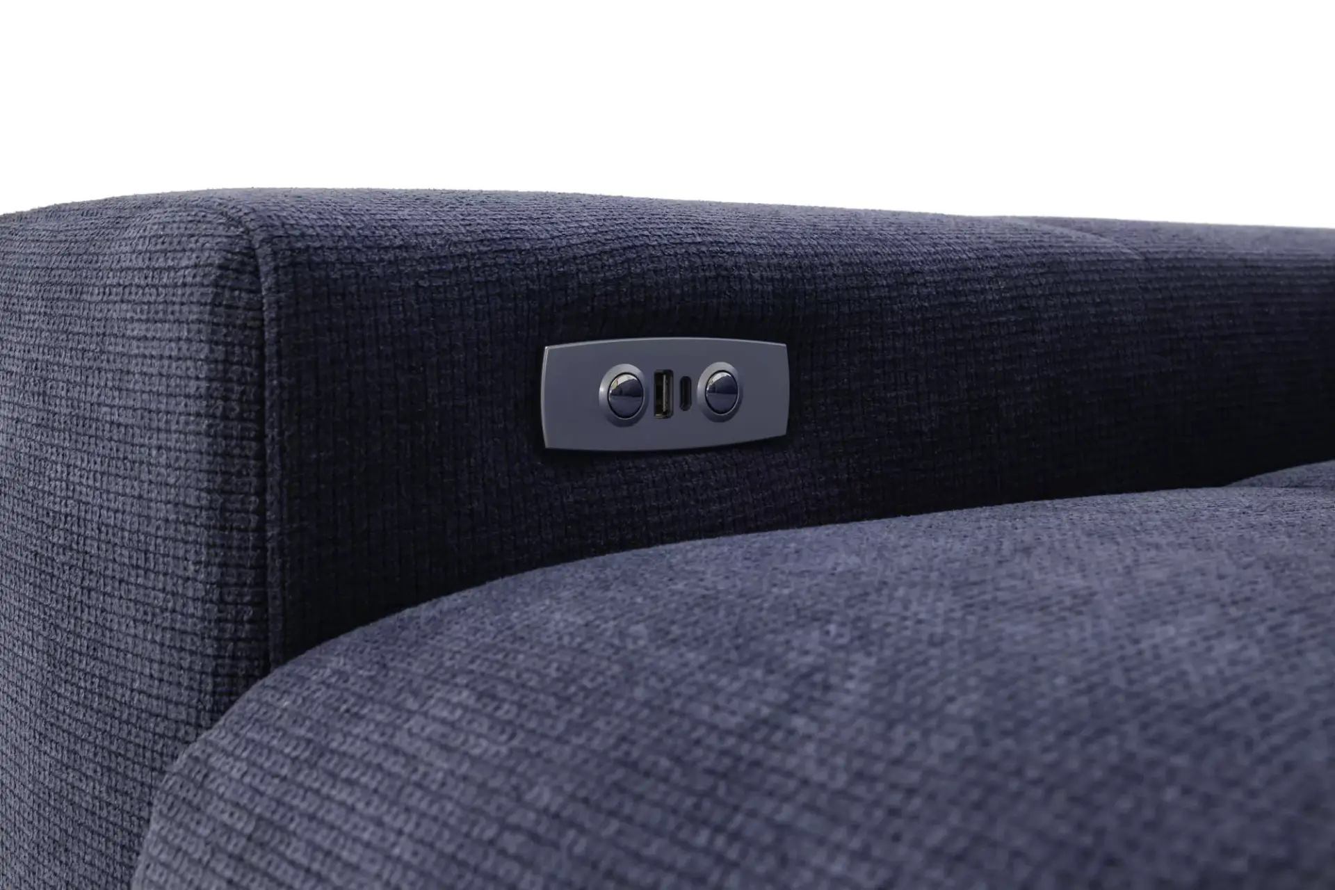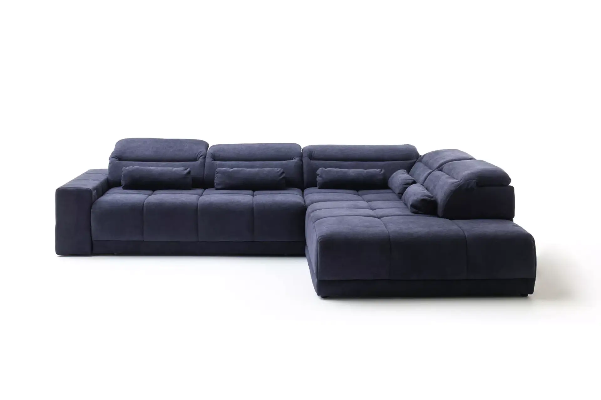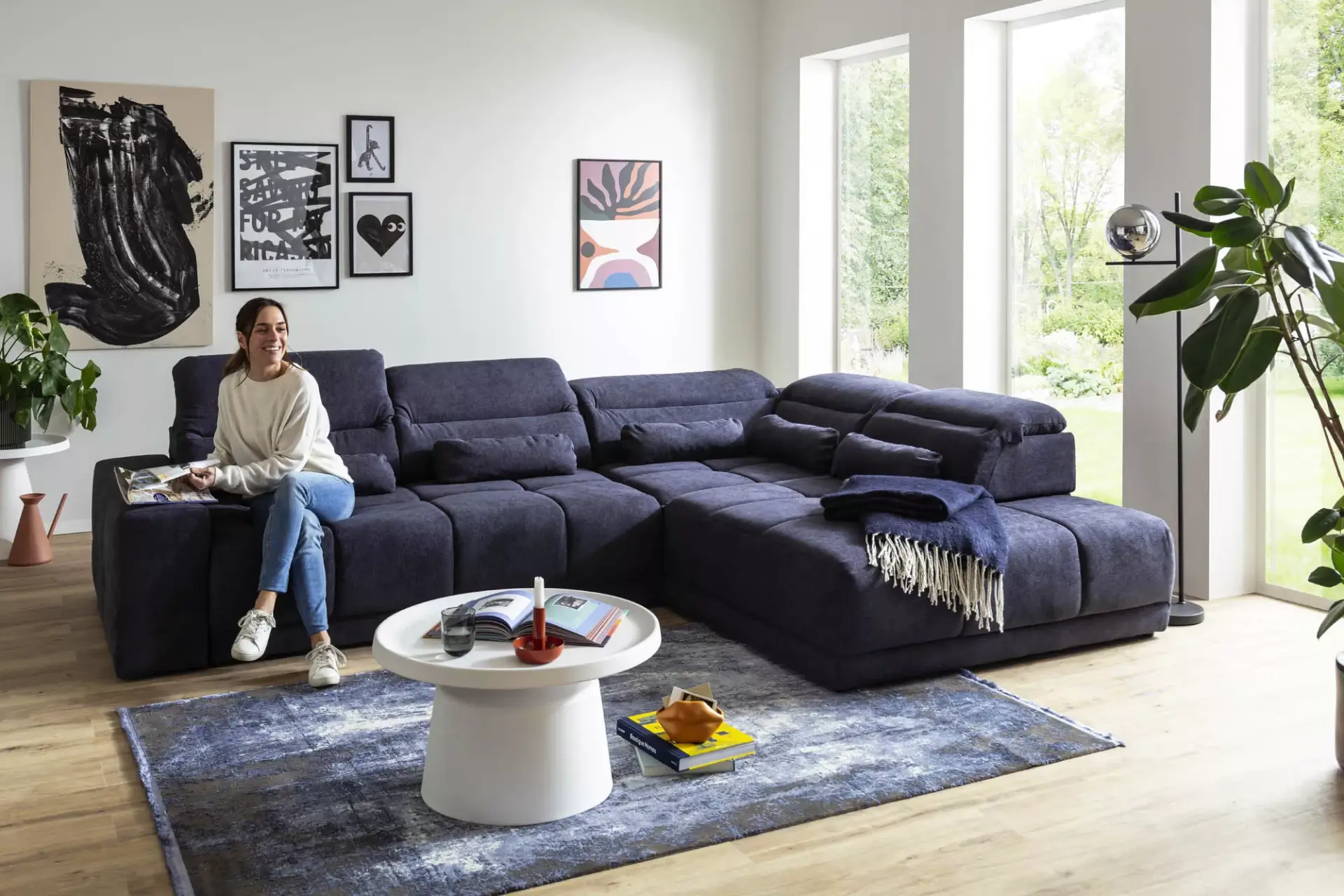 Kuschelige Wohnlandschaft mitstrapazierfähigem Bezug in blau, Boston 1880 (PG2), Nosagunterfederung, Schaumstoff, inklusive elektrischer XXL-Sitztiefenverstellung, 1x manuelle Sitztiefenverstellung und 5 manuellen Kopfteilverstellungen, mit 5 Nierenkissen, Schenkelmaß ca. 323x231 cm, Liegefläche ca. 131x234 cm.