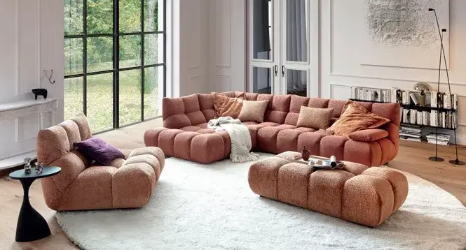 Trendige Wohnlandschaft mit imposanter Steppung, einem bewusst lockeren Polsteraufbau und einem interessanten Typenplan. Verschiedene Armlehnenvarianten und ein 360° Drehteller sind besonders hervorzuheben.