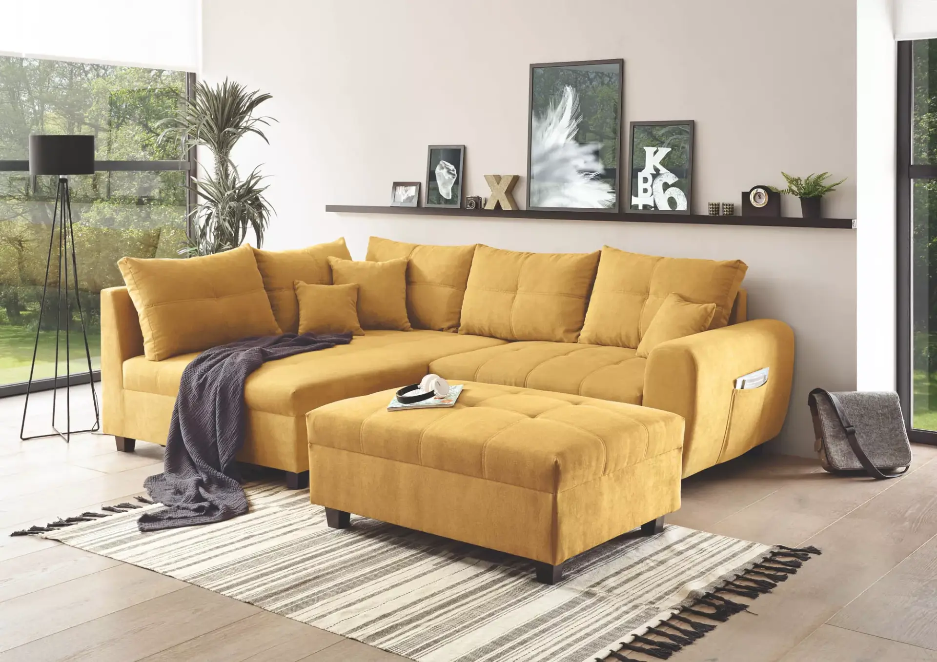 Beliebte Wohnlandschaft mit Bezug Uran 17 senf - 95% Polyester, 5% Nylon, Sitz mit Nosagfederung, Rücken mit Schaumstoffpolsterung, Kunststofffüße, inkl. 5 Rückenkissen, 1 Zierkissen 45x45cm, 2 Zierkissen ca.35x35cm, BHT ca. 248x87x176 cm, SH ca.42cm, ST ca.63cm, Rücken echt, rechts/links bestellbar.