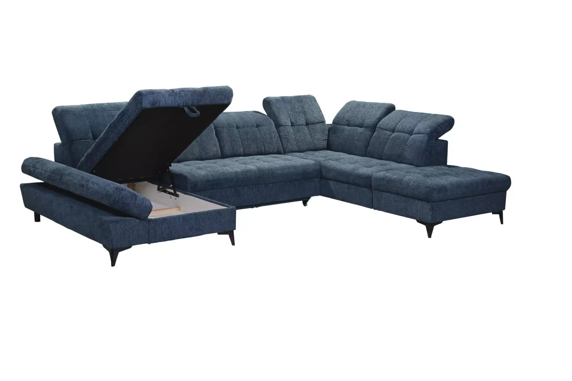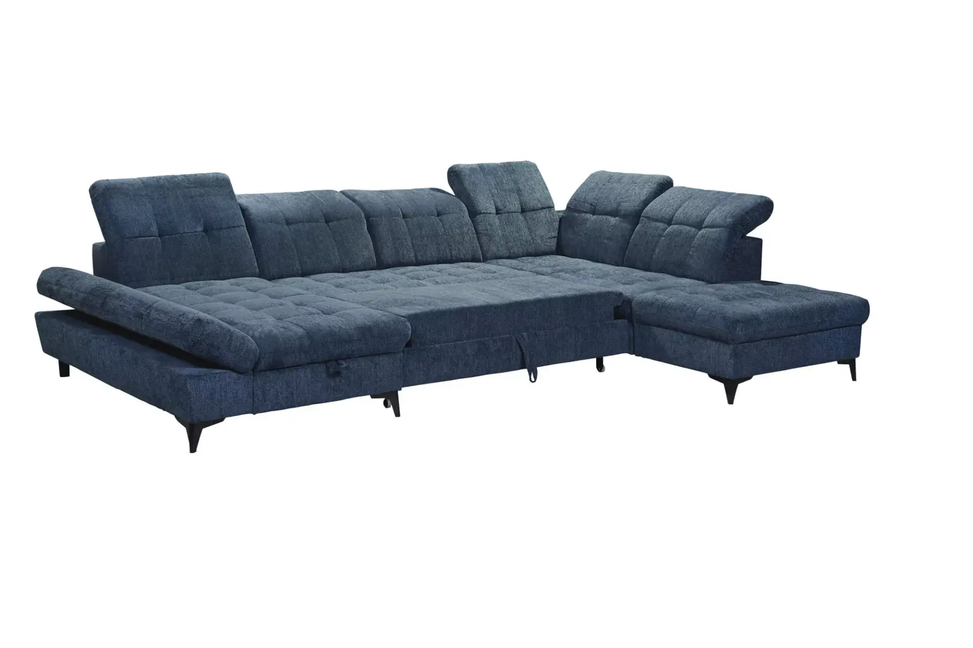 Wohnlandschaft mit Bezug Ravello 03 cashmere, Nosagfederung mit Schaumstoffpolsterung, Schlaffunktion mit Delfinbeschlag, Liegefläche 120x268cm, Bettkasten, 1 Armlehnverstellung, 6 Kopfteilverstellungen, schwarze Metallfüße, Rücken echt, Sitzhöhe 43cm, Sitztiefe 60cm, Sitzbreite 272cm, Stellmaß 245x275x168cm, rechts/links bestellbar.