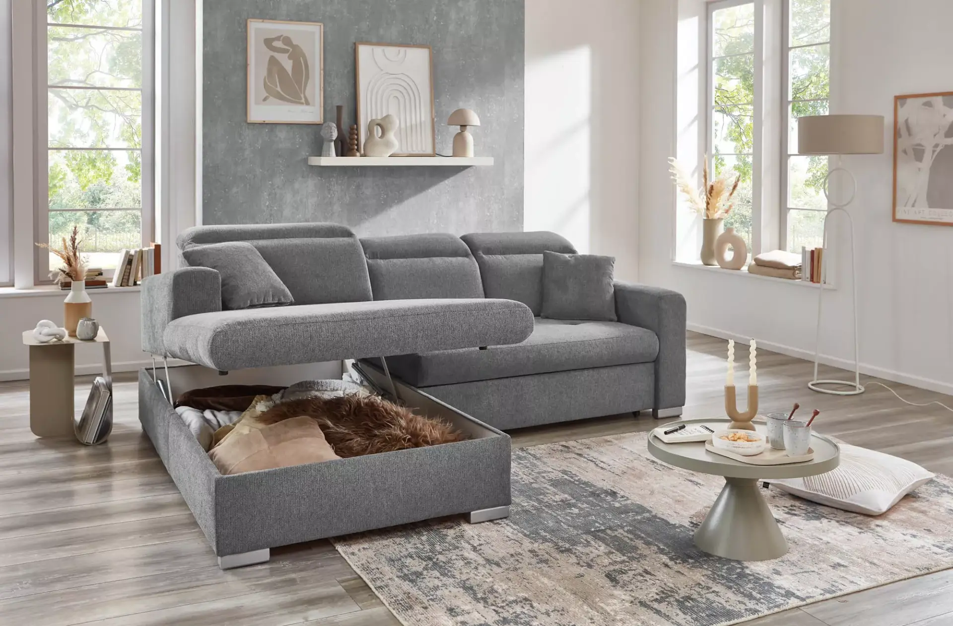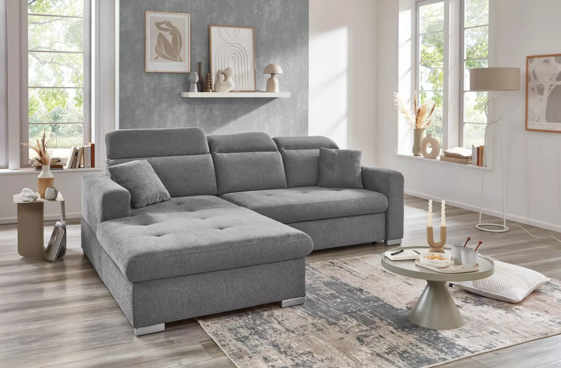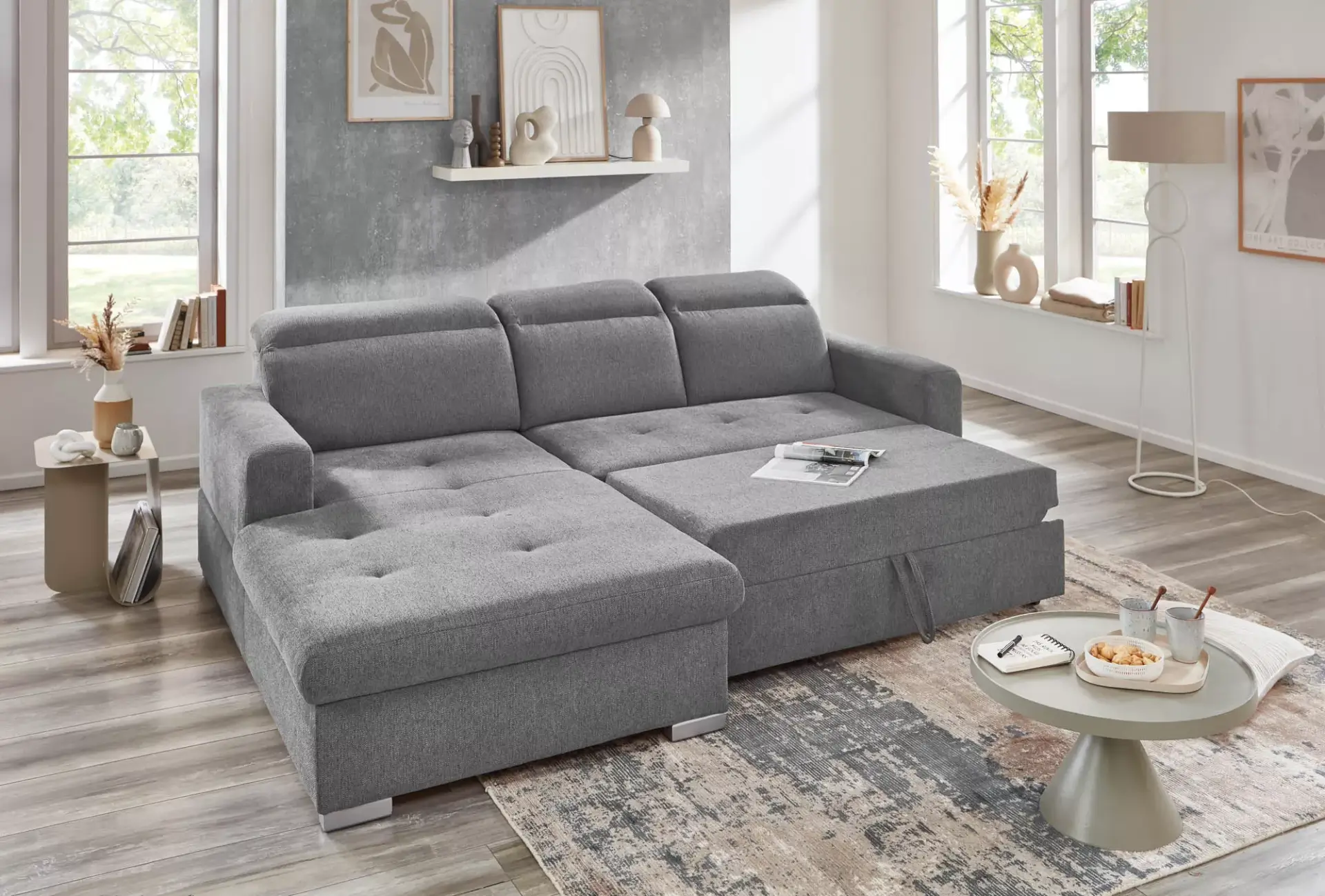 Bezaubenrndes Ecksofa mit Bezug Cristal 92 (PG 1), Nosagunterfederung mit 2 Schichten Polyätherschaumstoff, Bettfunktion, Bettkasten inklusive Springaufbeschlag, 3 manuell verstellbare Kopfstützen, Holzfüße in silber, inklusive 2 Zierkissen, Sitzhöhe ca. 44cm, Sitztiefe ca. 60cm, Stellmaß ca. 185x244cm.