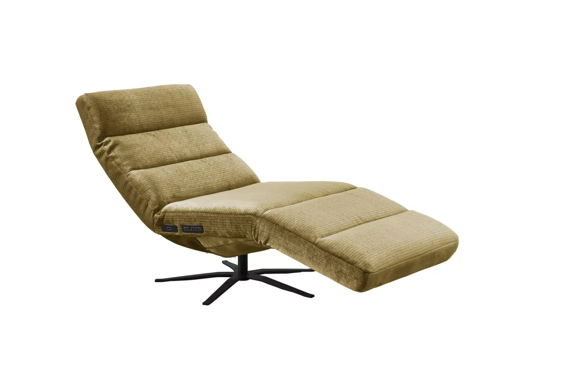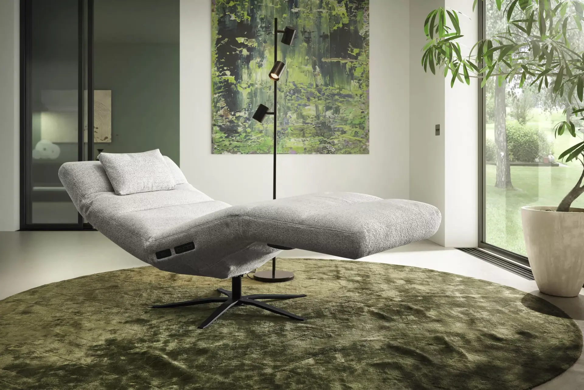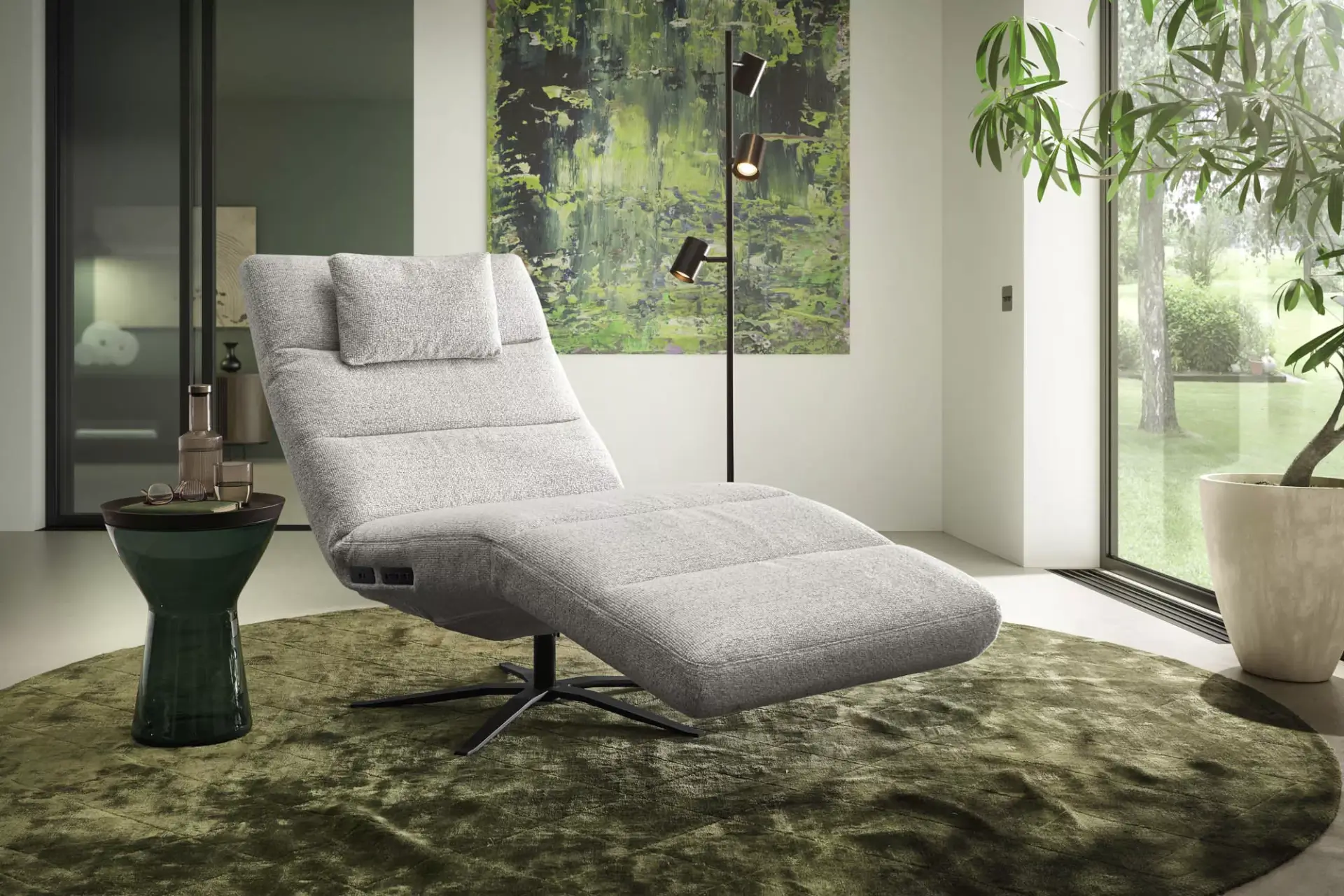Topmodische Polsterliege mit punktelastischem Tonnentaschenfederkernsitz, einem Rücken aus PU-Schaum bezogen und Rückenteil ebenso bezogen und mit motorischer Relaxfunktion.