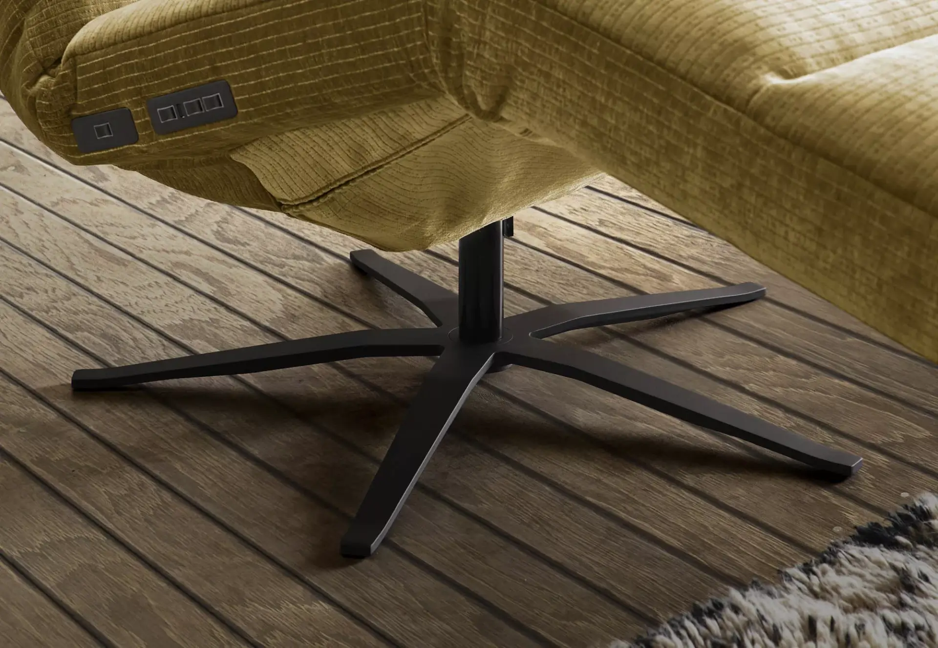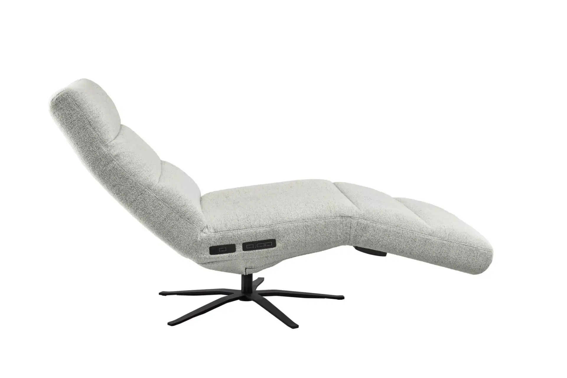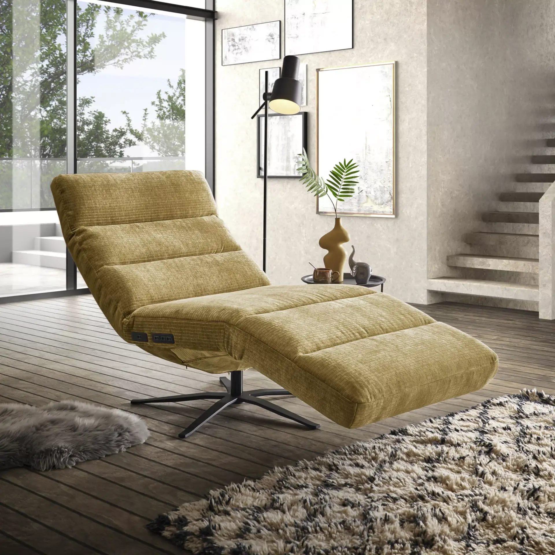 Topmodische Polsterliege mit punktelastischem Tonnentaschenfederkernsitz, einem Rücken aus PU-Schaum bezogen und Rückenteil ebenso bezogen und mit motorischer Relaxfunktion.