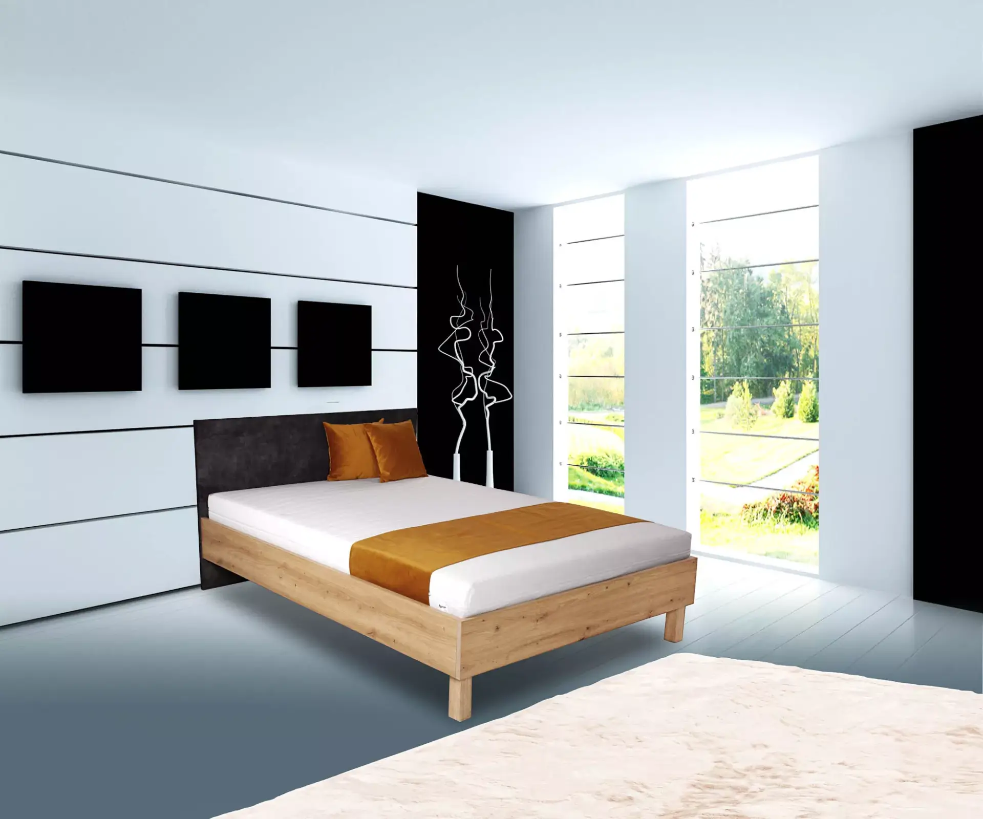 Modernes Bettgestell in 140 x 200cm, Gestell in Artisan Eiche Nachbildung, Kopfteil in Stoff 7047, 2 Holzfüße, inklusive Rollrost und Komfortschaummatratze. Ebenfalls in 120 x 200 cm erhältlich.Produktübersicht