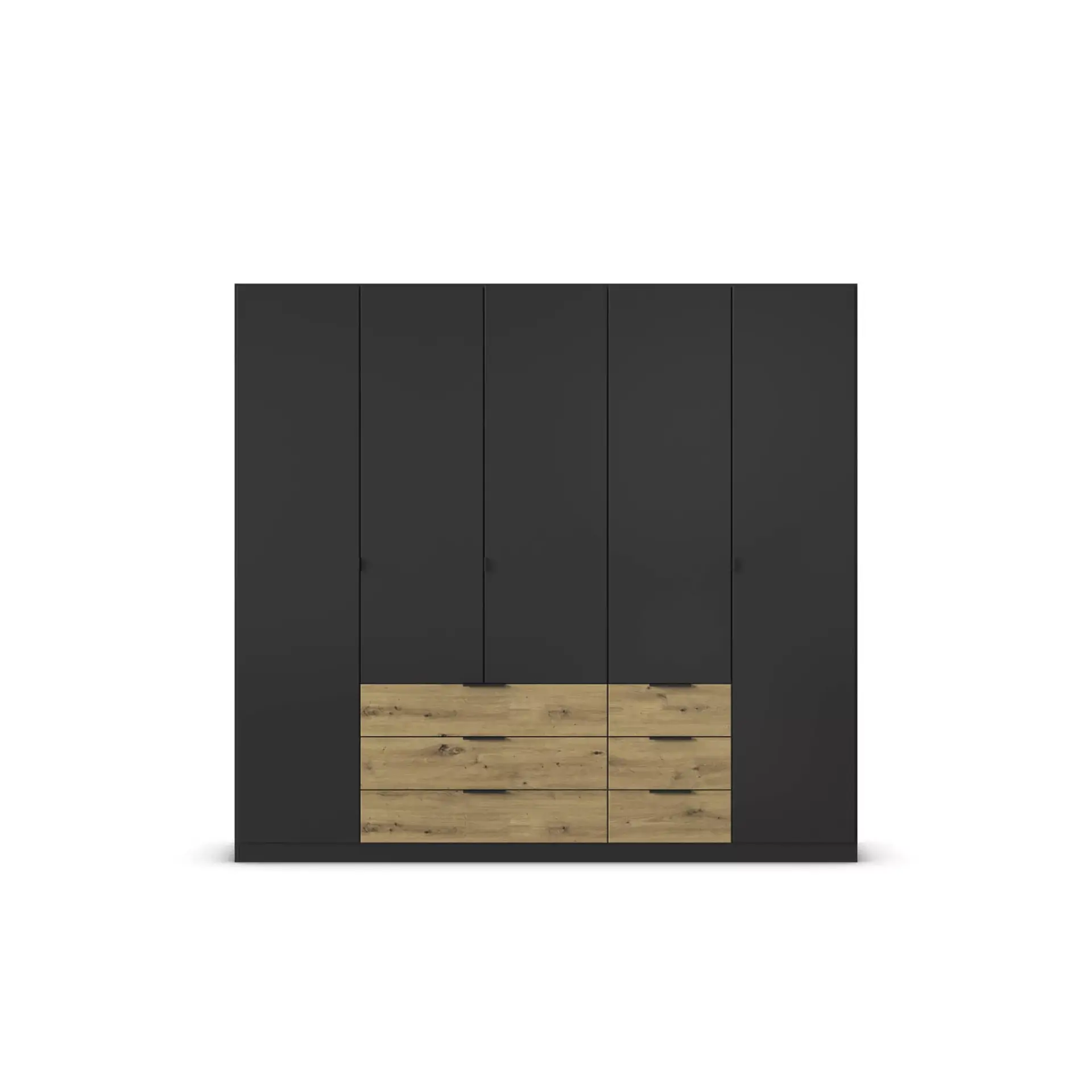 Aktueller Kleiderschrank in der Ausführung -AG446 grau-metallic, Absetzungen Eiche Artisan Nachbildung, 5-türig, 6 Schubkästen, BHT ca. 226x210x54cm.