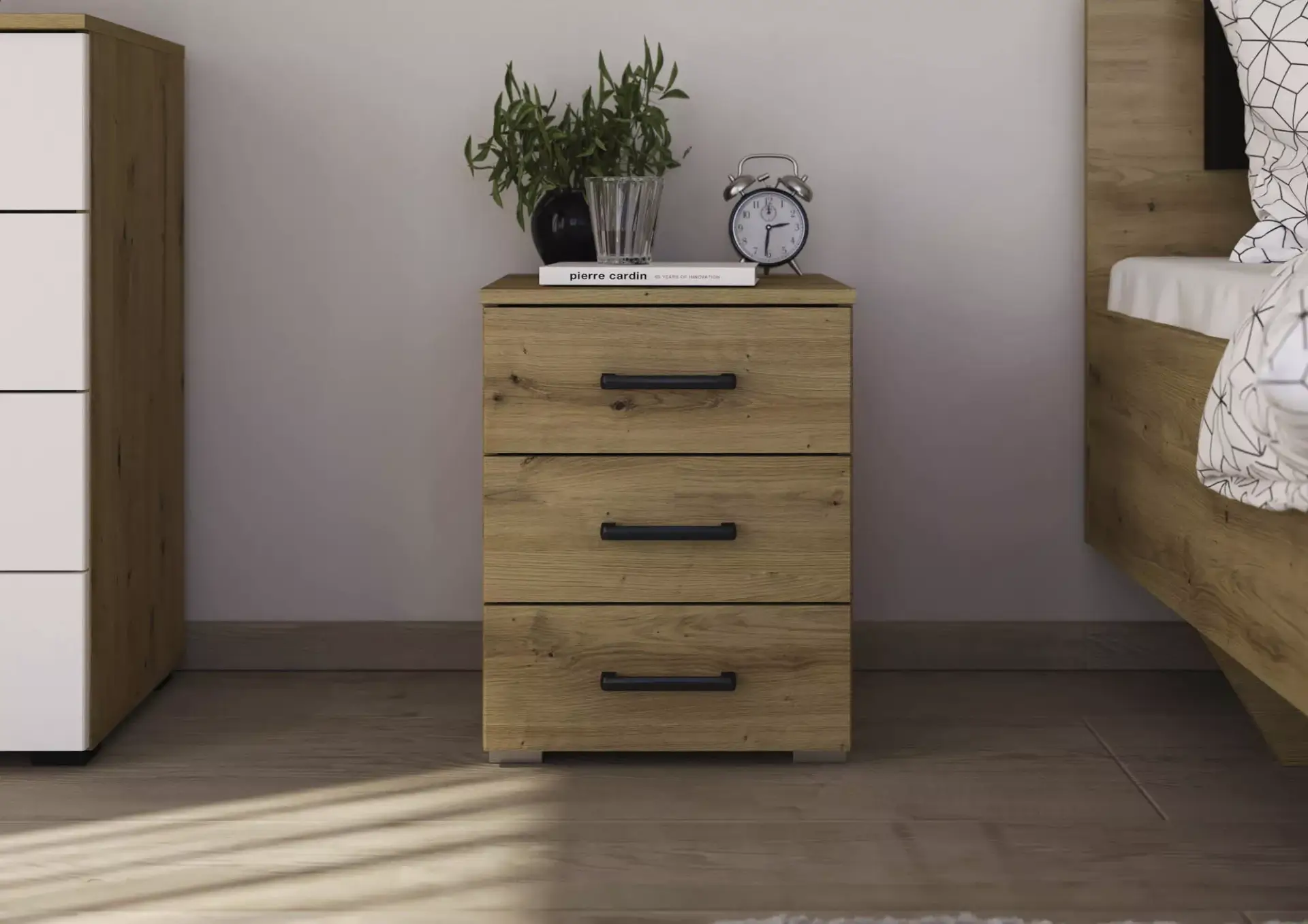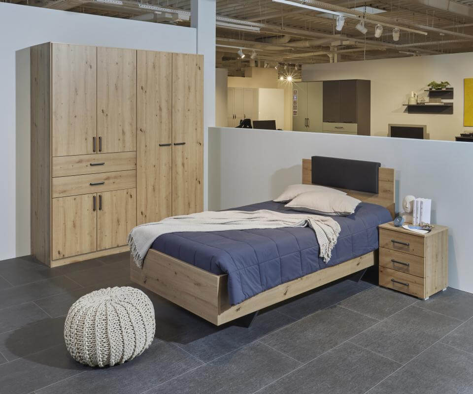 Seniorenschlafzimmer mit Front und Korpus in Eiche Artisan Nachbildung oder in Alpinweiß.
