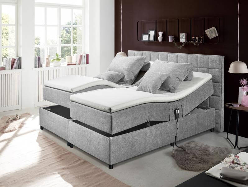Bezauberndes Polsterbett mit Bezug Lars 90 silver -100% Polyester, mit Motor, Füße Kunststoff, Gestell aus Holzwerkstoff, 9-Zonen-Tonnentaschenfederkern, 1 Lage mit 1cm Schaum T25, HR-30-Topper (6cm), Bezug waschbar bis 40°, Liegefläche ca. 180x200cm, BHT ca. 202x112x210 cm, Liegehöhe ca. 63 cm.