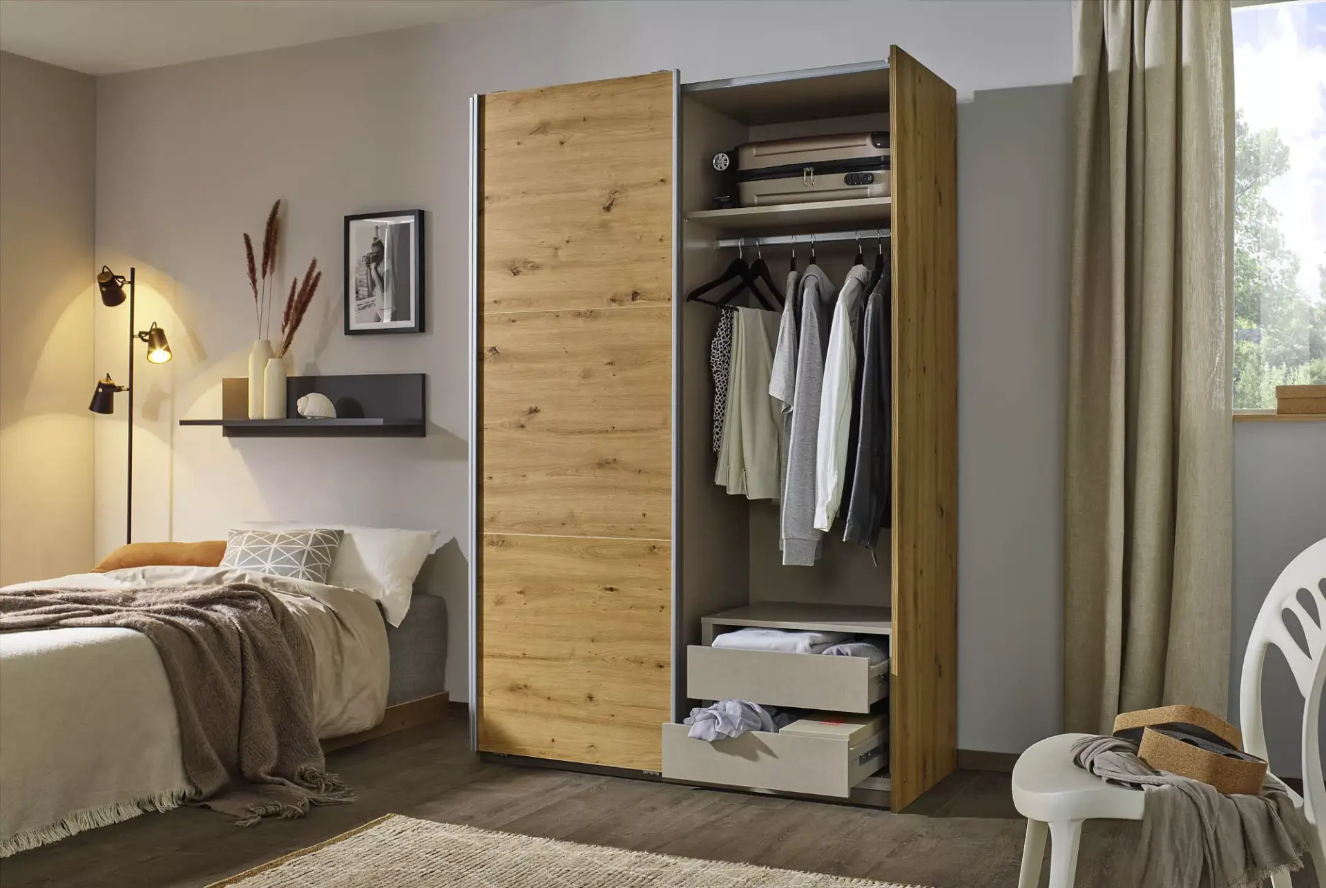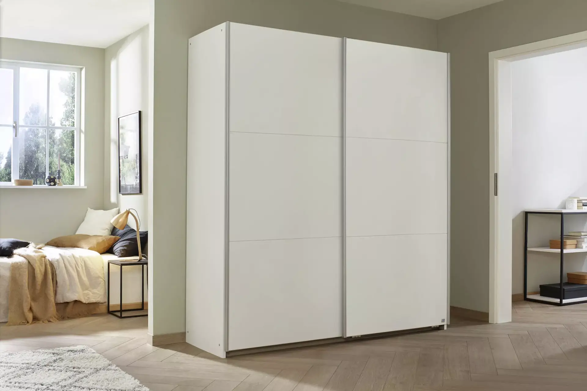 Schwebetürenschrank 2trg. in Ausführung AC350 alpinweiß, mit Spiegel, Griffleisten alufarben, BHT ca. 131x197x59cmProduktübersicht
