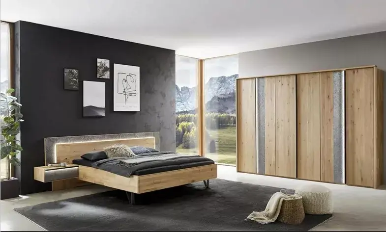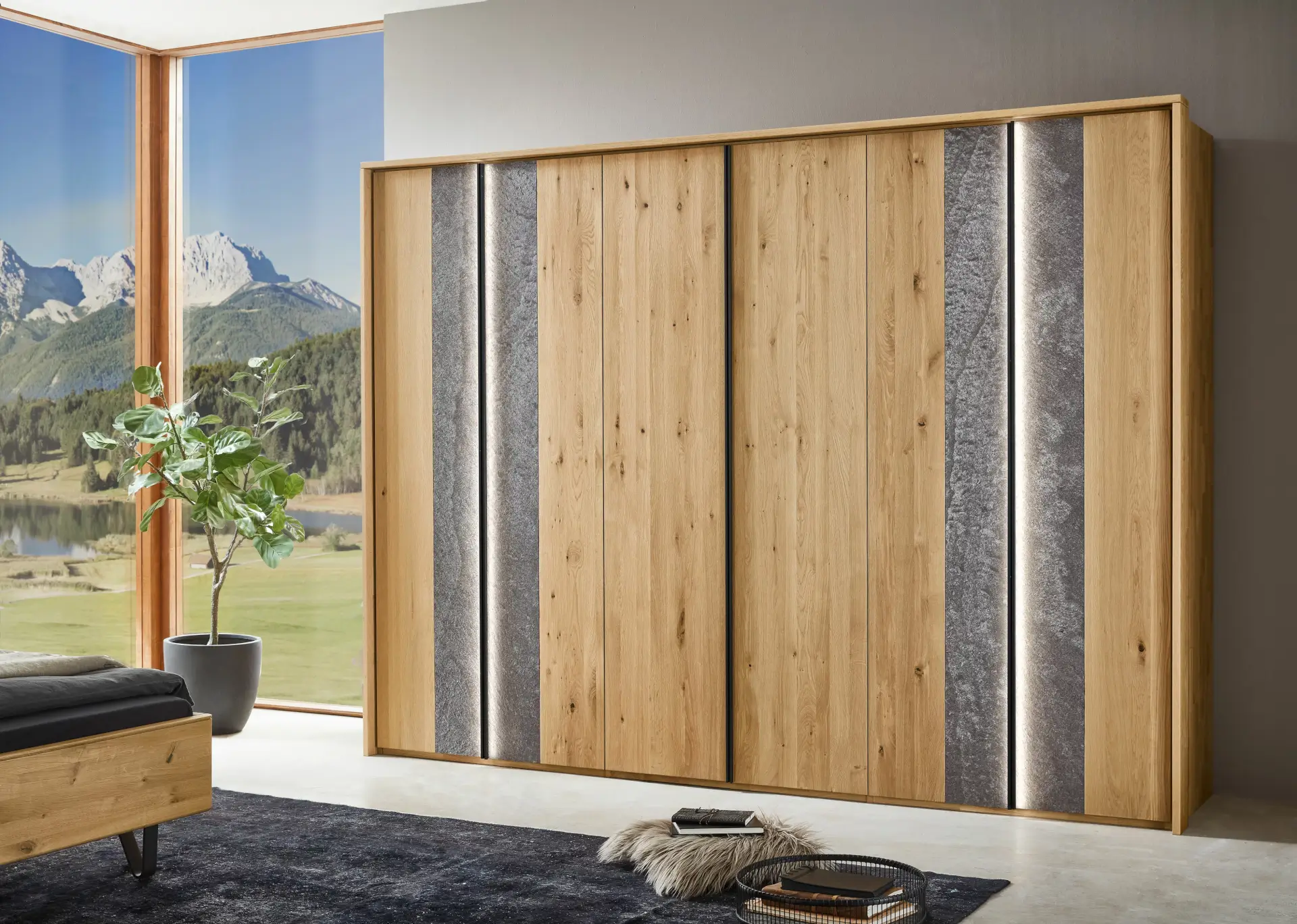 Dieses Massivholz-Schlafzimmer ist ein Rückzugsort zum Verweilen und Entspannen. Lassen Sie sich von der warmen Ausstrahlung der massiven Wildeiche und den echten Natur-Details inspirieren! Die ausdrucksstarken Steinfurnier-Akzente setzen einzigartige Highlights, die Ihrem Schlafzimmer eine echte Portion Natur verleihen. Entstehend aus echten Schieferblöcken, überzeugt der Akzent durch seine individuellen Strukturen und Farbvarianten. Die Herstellung erfolgt durch das Abspalten von Steinoberflächen, die rückseitig mit GFK-Trägern verstärkt werden. Jeder Akzent ist ein Unikat. Und das Beste? Die clever eingebauten LED-Highlights, an den Griffen und der Kopfteilumrandung, sorgen auf Wunsch für eine besonders gemütliche Atmosphäre.
