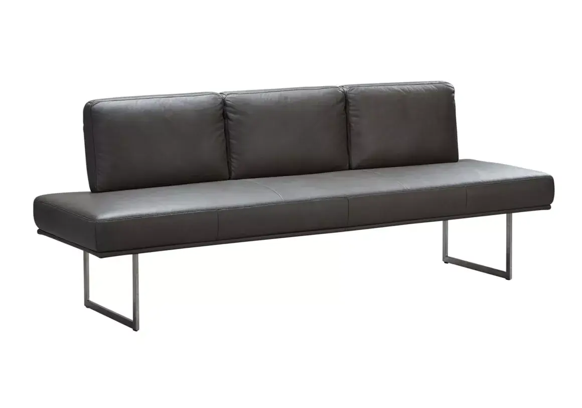 Legeres, kubisches Dining-Programm mit geteiltem Sitz und einzelnen Rückenkissen. Der Rücken der Solobänke ist auf jeder Seite, sowie bei den Anbauecken und Bankelementen am offenen Abschluss um ca. 20 cm eingerückt. Wählen Sie aus zwei Fußvarianten Ihren Favoriten aus: A Hochkantkufe oder B schmale Flachstahlkufe in Metall schwarz Struktur oder Edelstahl gebürstet.
