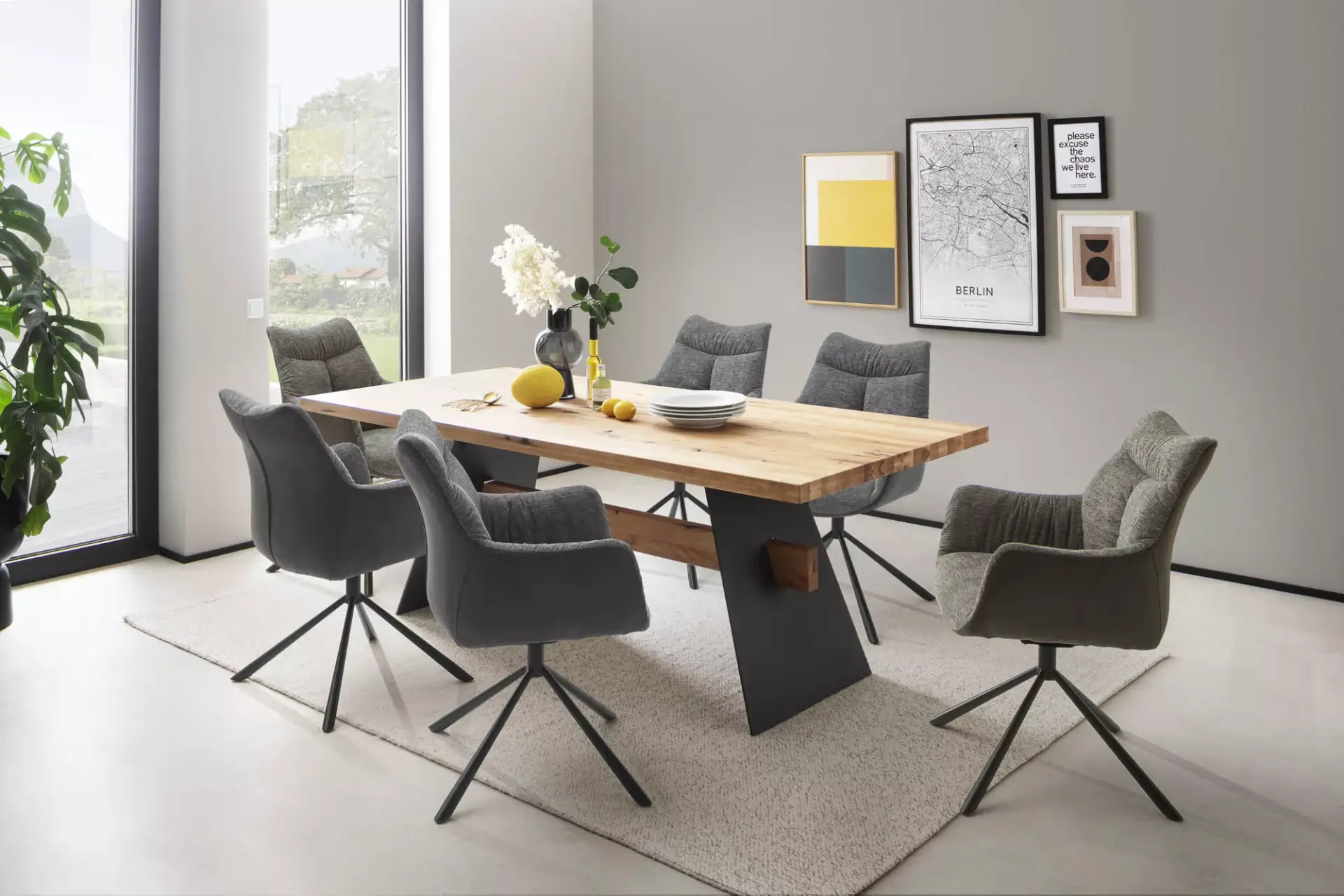 Trendiger Esstisch in Balkeneiche mit durchgehender Lamelle in Wildeiche geölt mit einer aufgedoppelten Tischplattenstärke von 50 mm. Gestell Metall anthrazit, pulverbeschichtet.