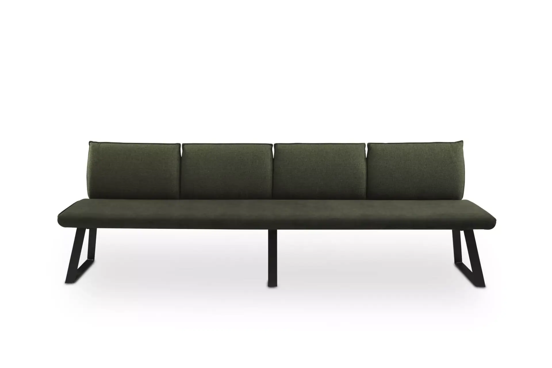 Neues Bank-Modell mit Lehne in Kissenoptik. Sowohl Sitz als auch Lehne sind mit Kedernaht gefertigt. Um eine durchgängige Designsprache zu halten, wurden die Gestelle in A-Form aus pulverbeschichtetem Metall mit Holzsteg gefertigt.