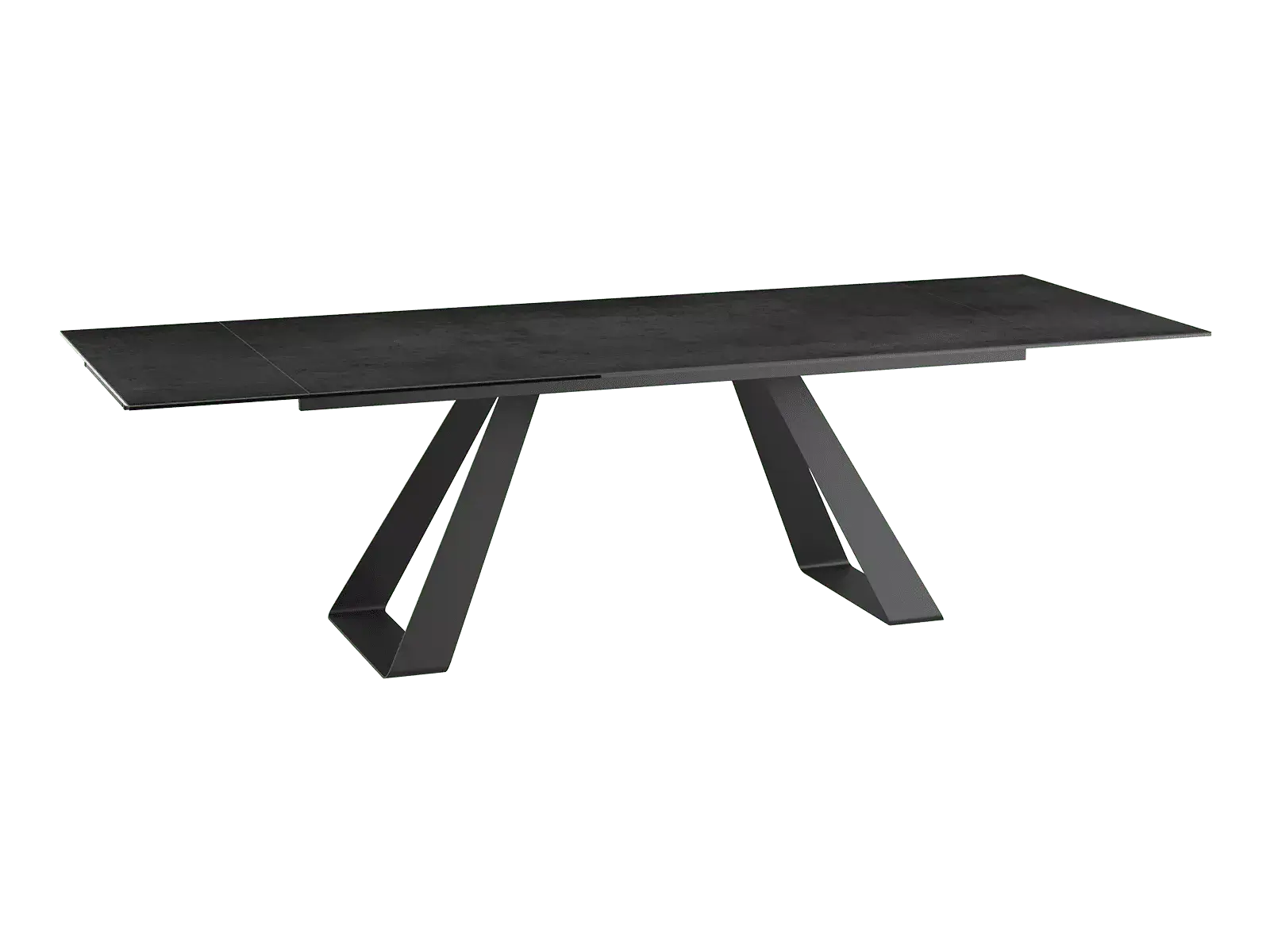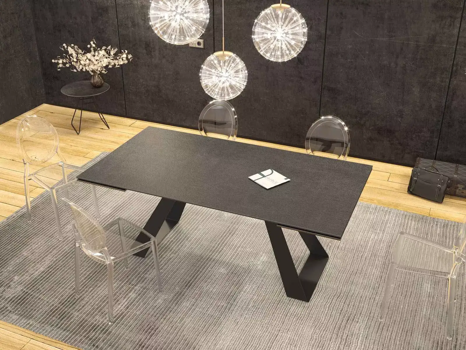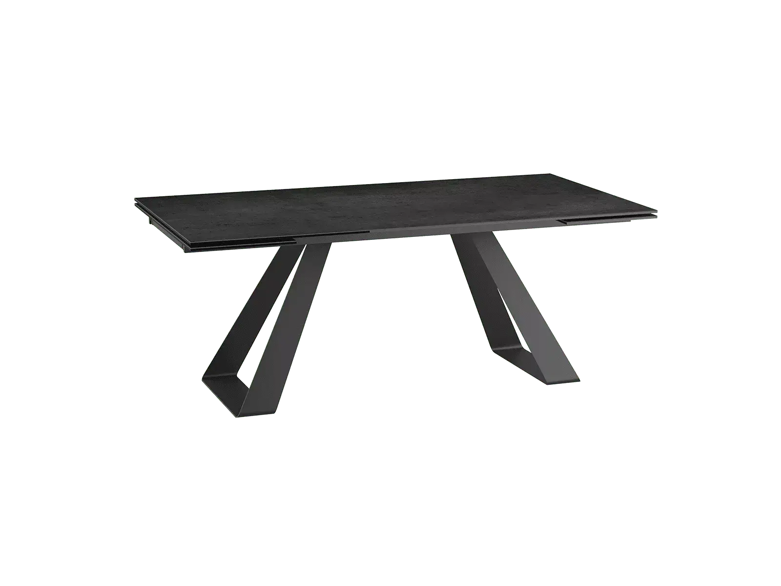 Dieser neue Esstisch begeistert mit seiner Eleganz und seinem Stil. Eine titanfarbene Keramikplatte auf zwei schönen, dreieckigen Tischfüßen überzeugt von seinem klassischen Look. Seine zwei sich unter der Tischplatte befindlichen Auszüge ermöglichen ein gemütliches Abendessen im großen Kreis.