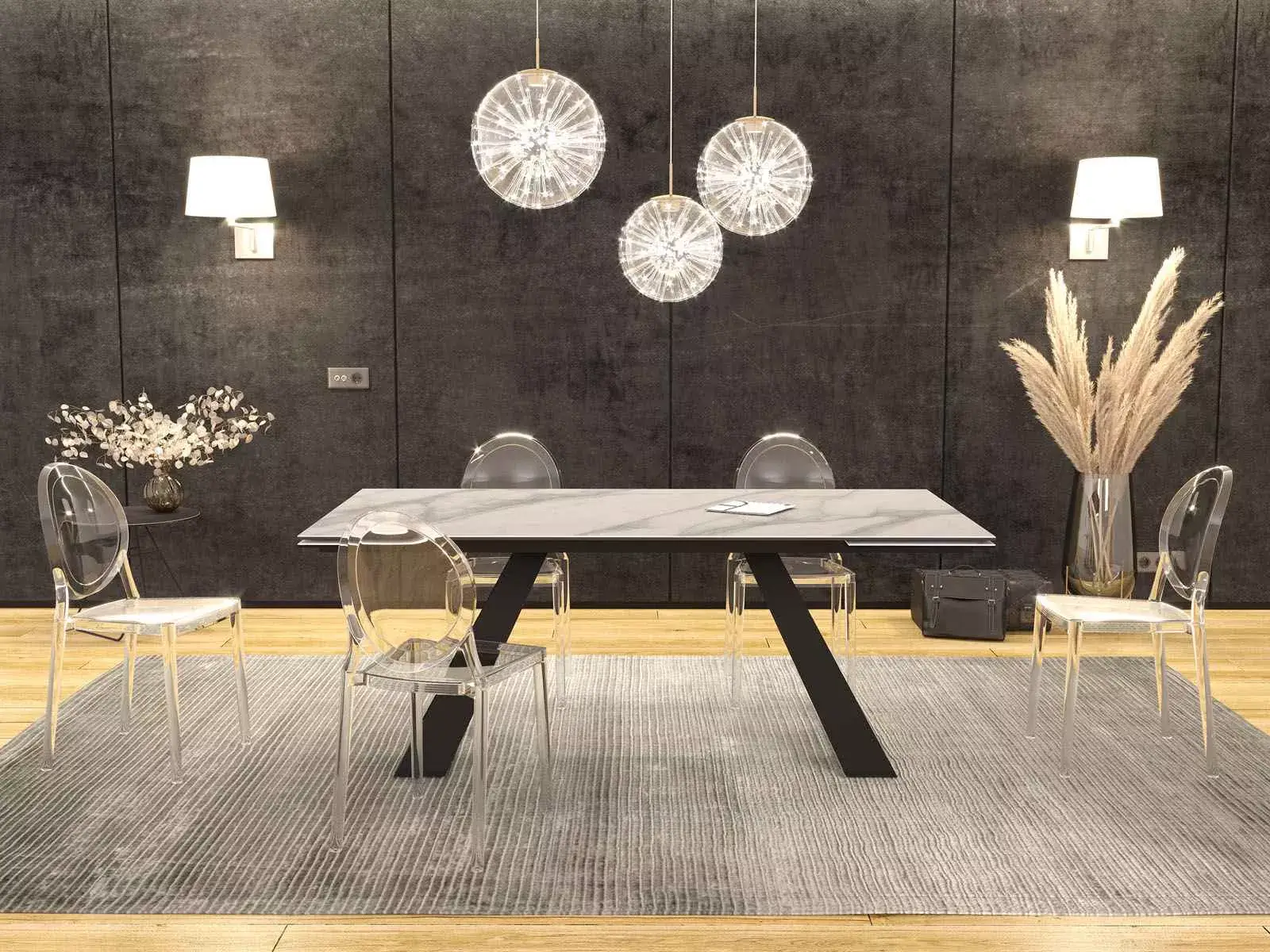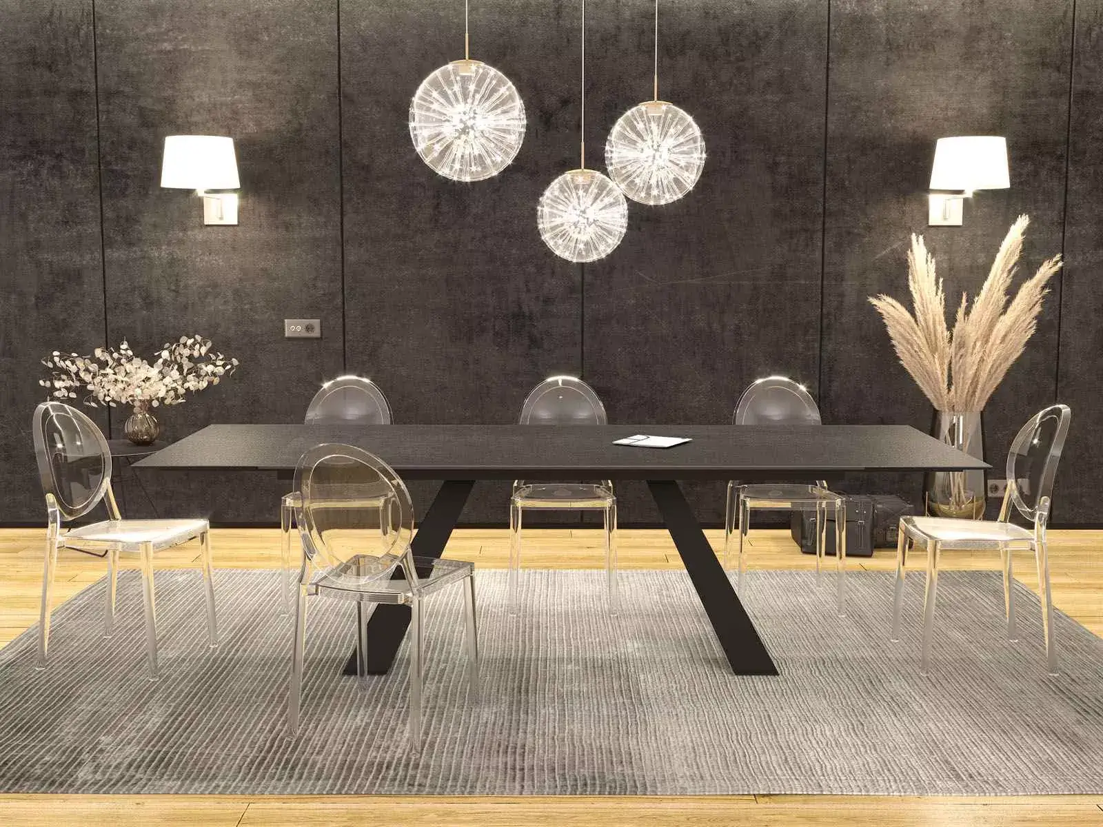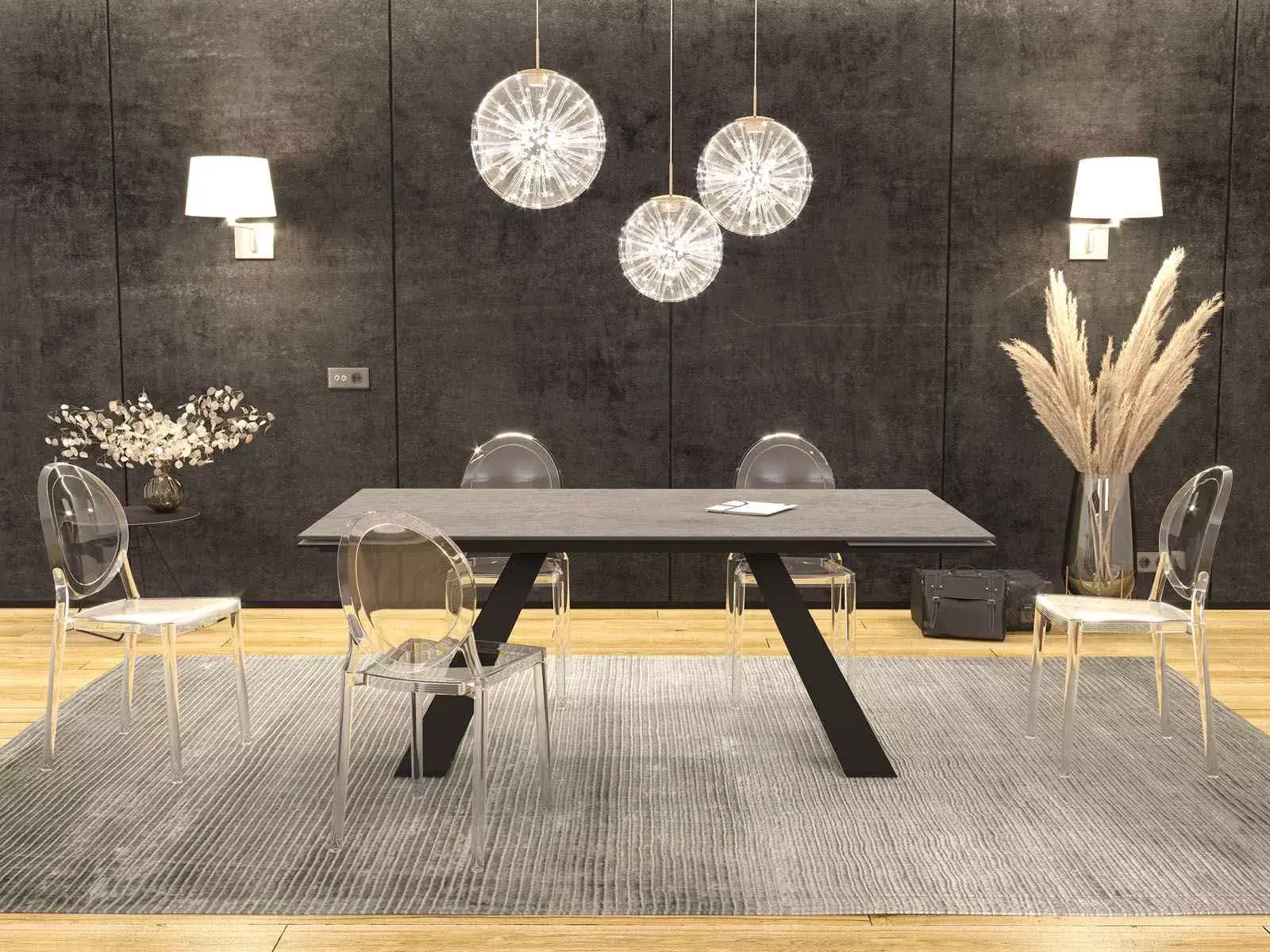 Dieser neue Esstisch begeistert mit seiner Eleganz und seinem Stil. Eine titanfarbene Keramikplatte auf zwei schönen, dreieckigen Tischfüßen überzeugt von seinem klassischen Look. Seine zwei sich unter der Tischplatte befindlichen Auszüge ermöglichen ein gemütliches Abendessen im großen Kreis.