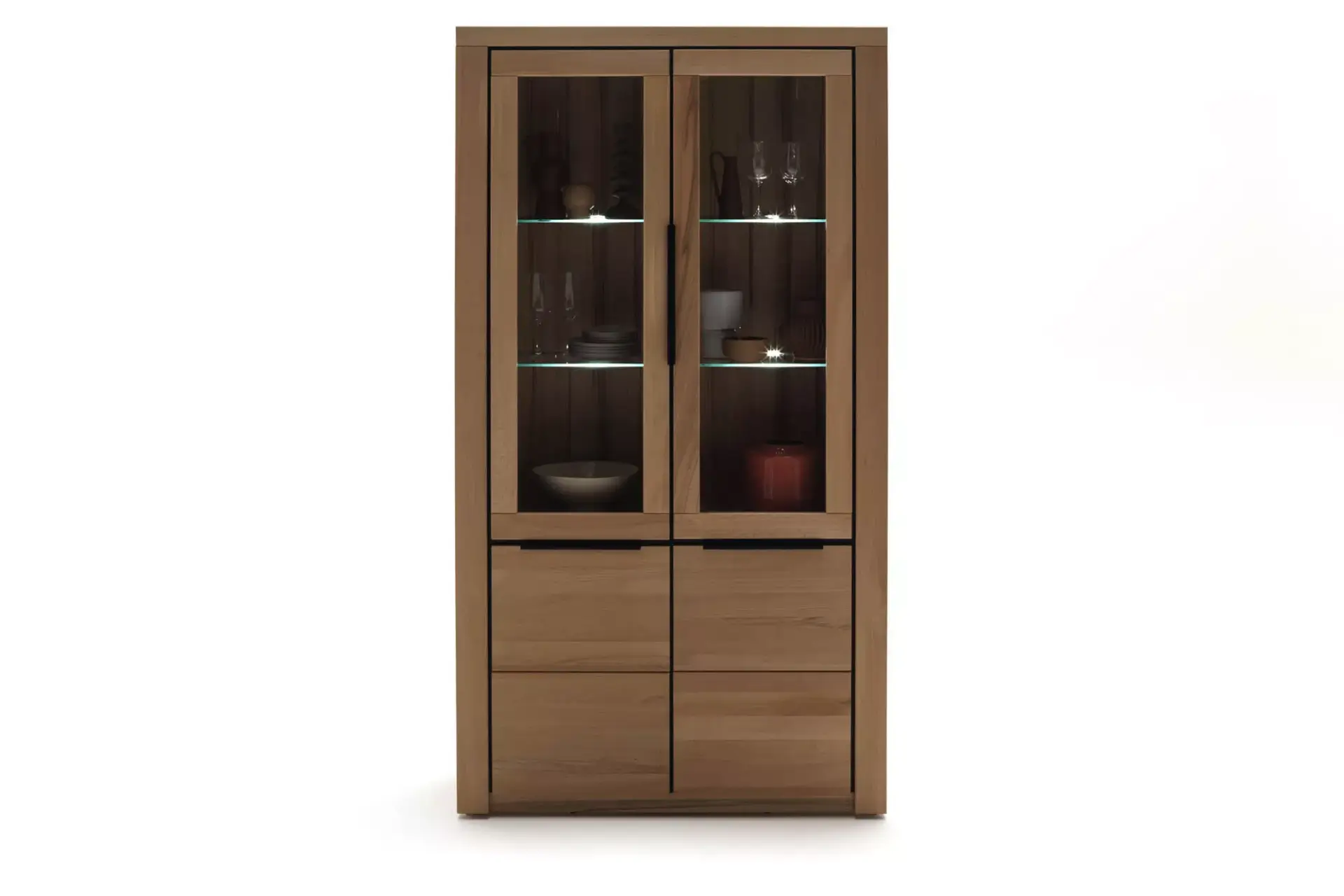 Trendiges Programm mit Fronten in Kernbuche massiv, Korpus Nachbildung. Schattenfugen sind ebenso wie die Griffe in schwarz.