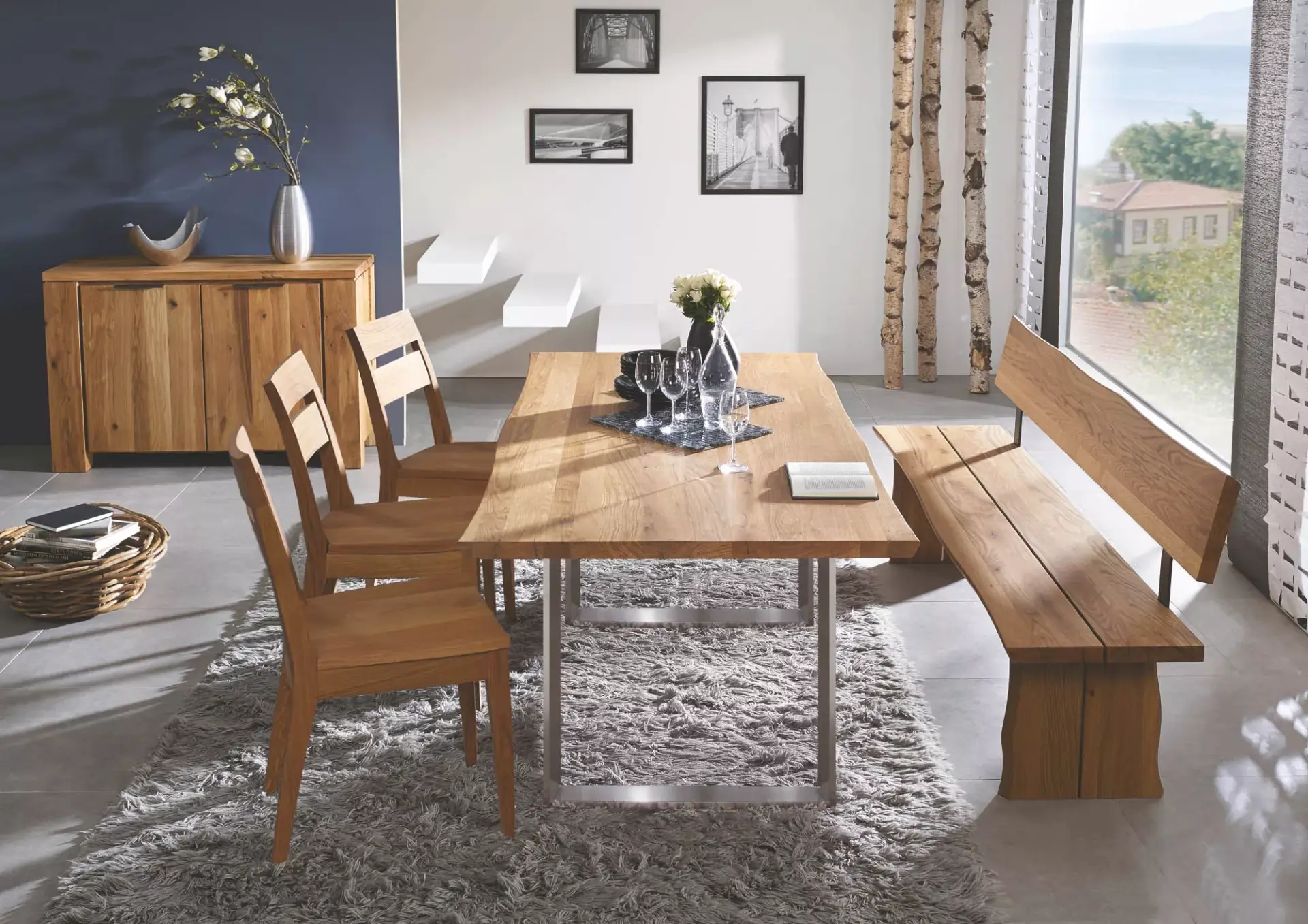 Massiver Tisch mit Platte in Wildeiche massiv geölt mit Baumkante,