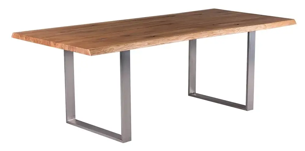 Moderner Esstisch mit Tischplatte in Eiche, Kernbuche und Nussbaum. Das Untergestell ist erhältlich in Edelstahl und Pulverbeschichtet Anthrazit RAL 7021,
