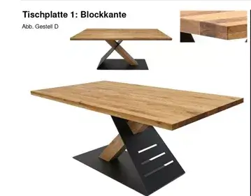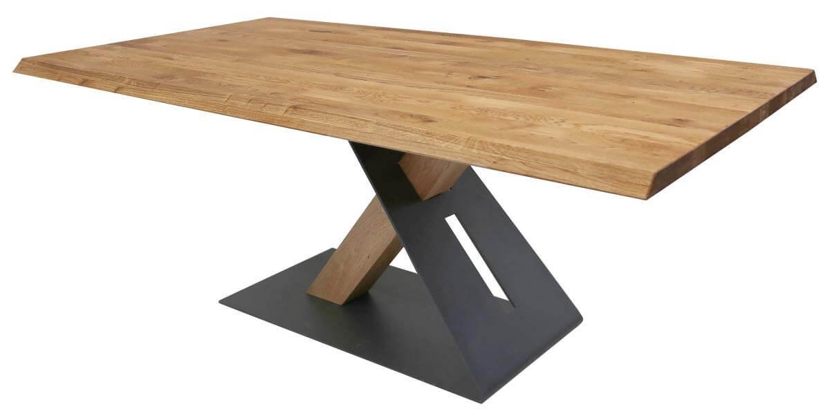 Esstischsystem in Eiche massiv rustik geölt, durchgehende Lamelle, 3 Breiten, 2 Plattenvarianten: Blockkante, 2+2 cm aufgedoppelt oder Super-Schweizer-Kante, 2+2 cm aufgedoppelt, 2 Gestellvarianten Metall schwarz oder anthrazit.
