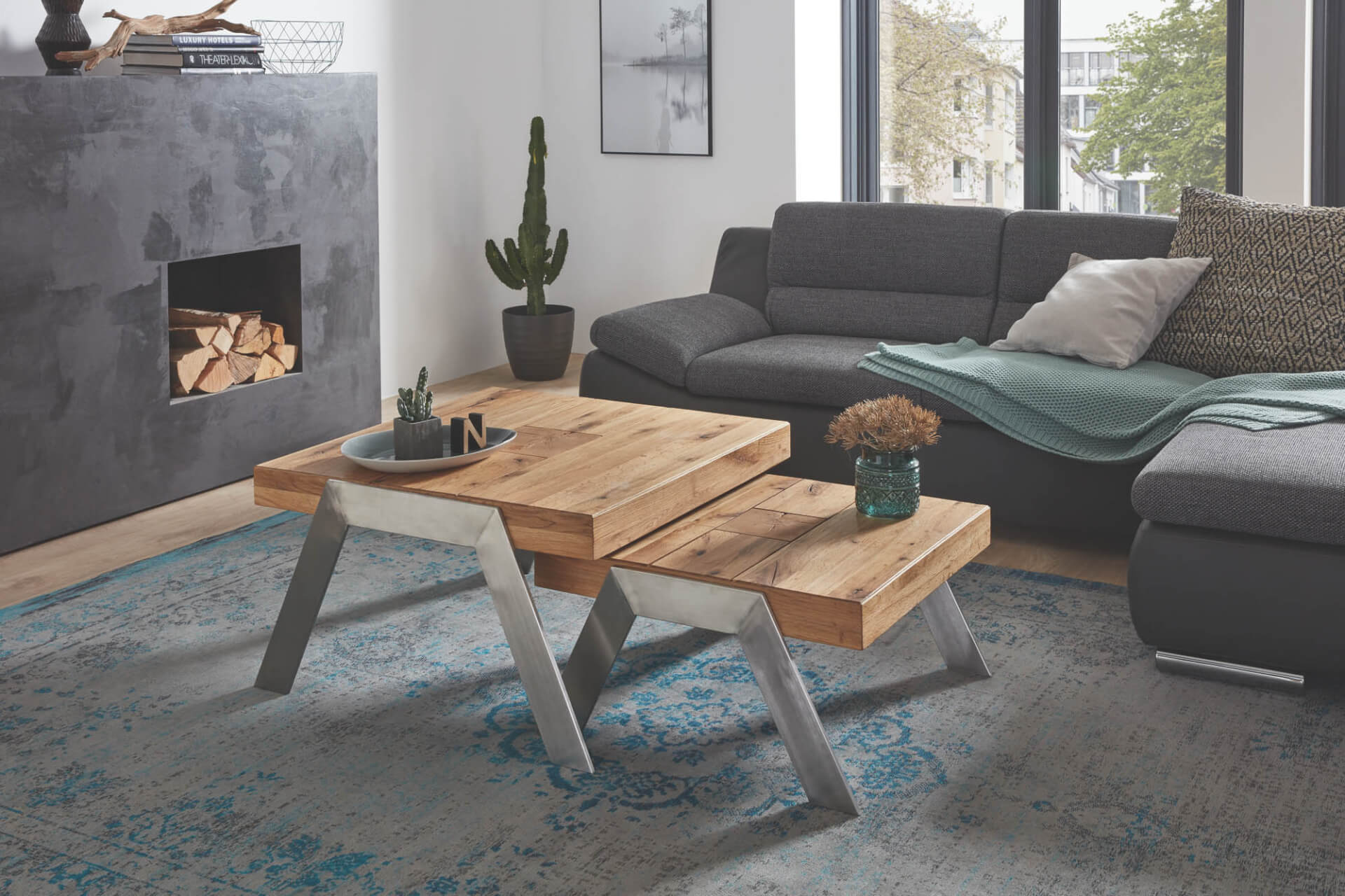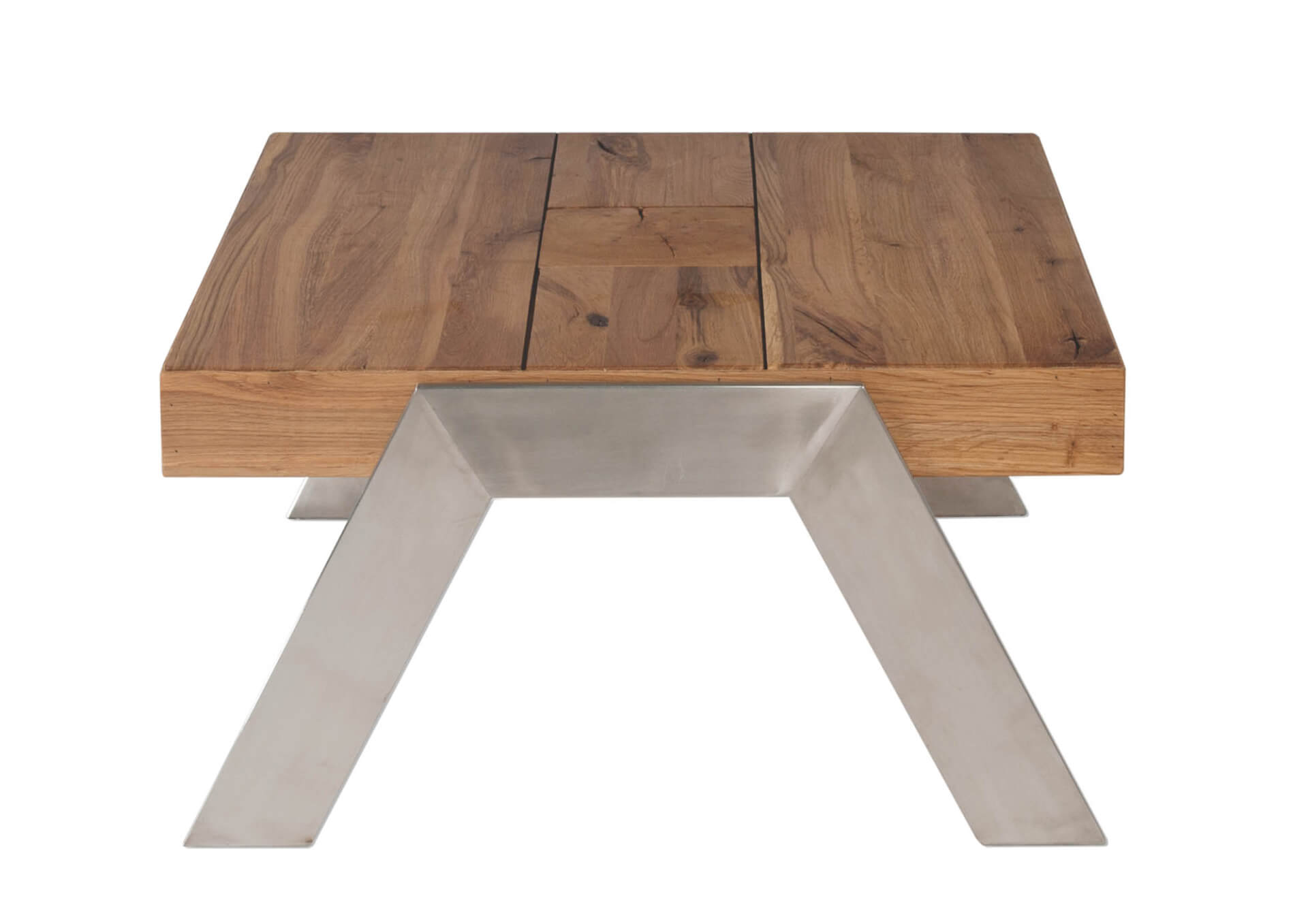 Stylischer Couchtisch mit einer Holzplatte in Wildeiche massiv, Antik mit Intasienverlegung mit gewollten Gebrauchsspuren.