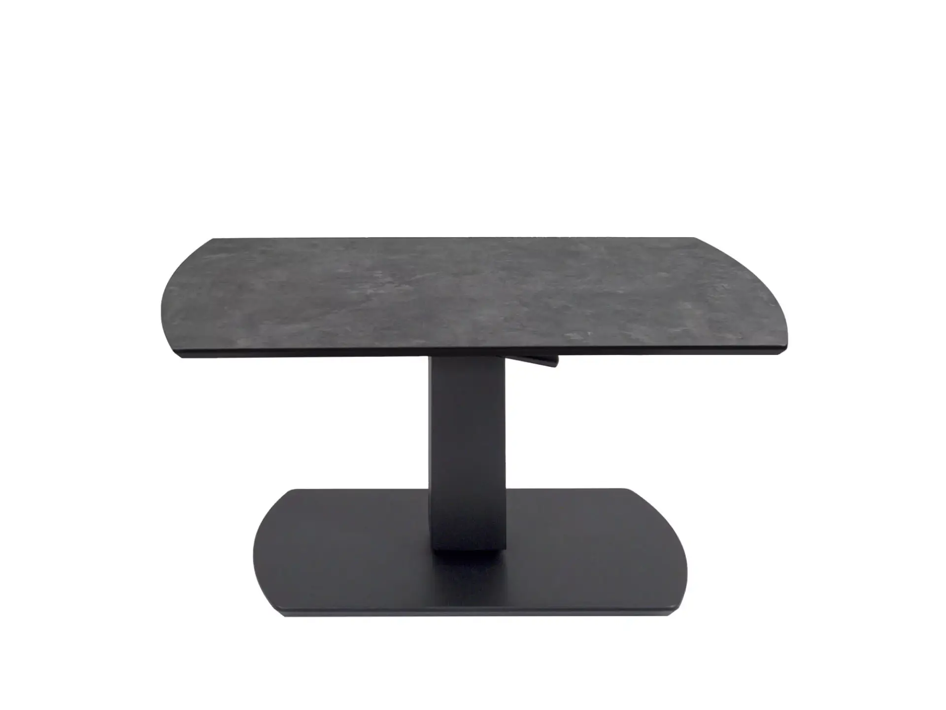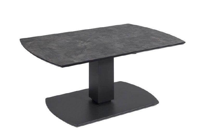 Höhenverstellbarer Couchtisch mit MDF-Tischplatte mit HPL Auflage in Metal Rock und einer lackierten Bodenplatte auf Rollen.