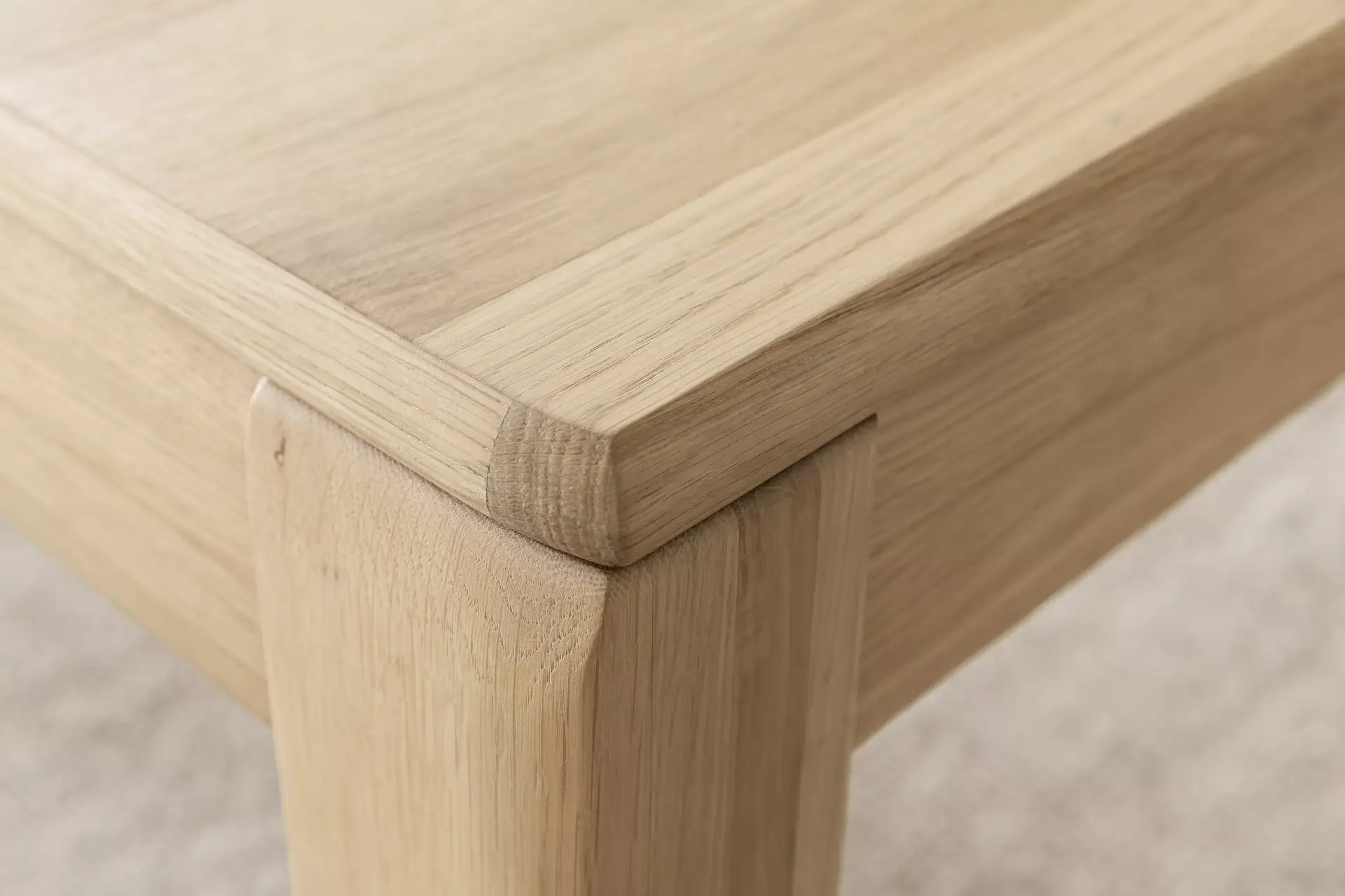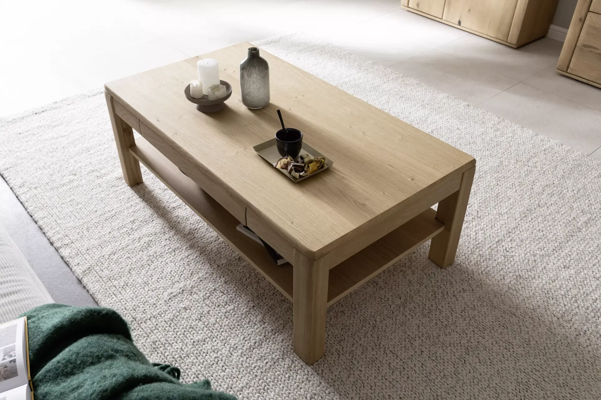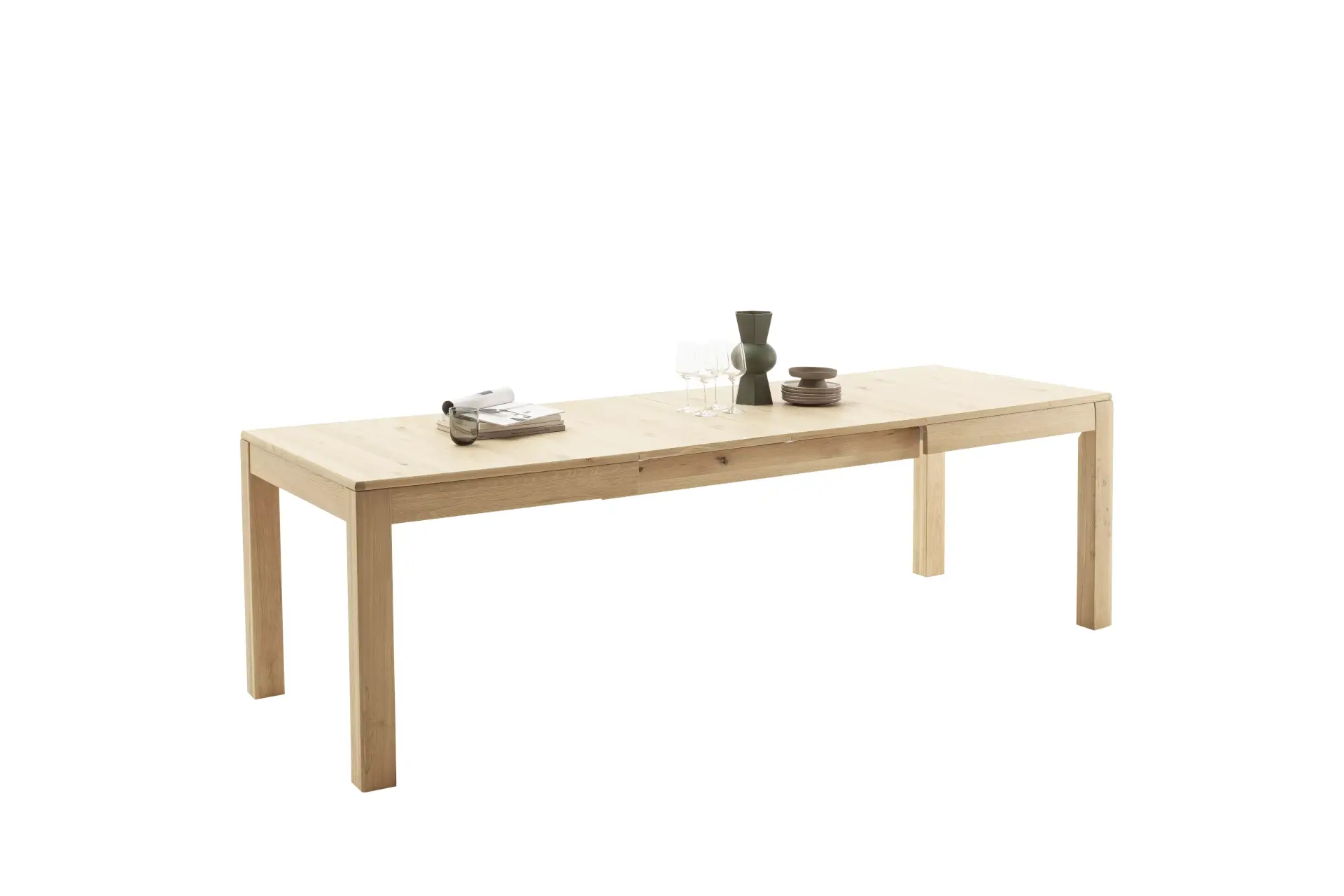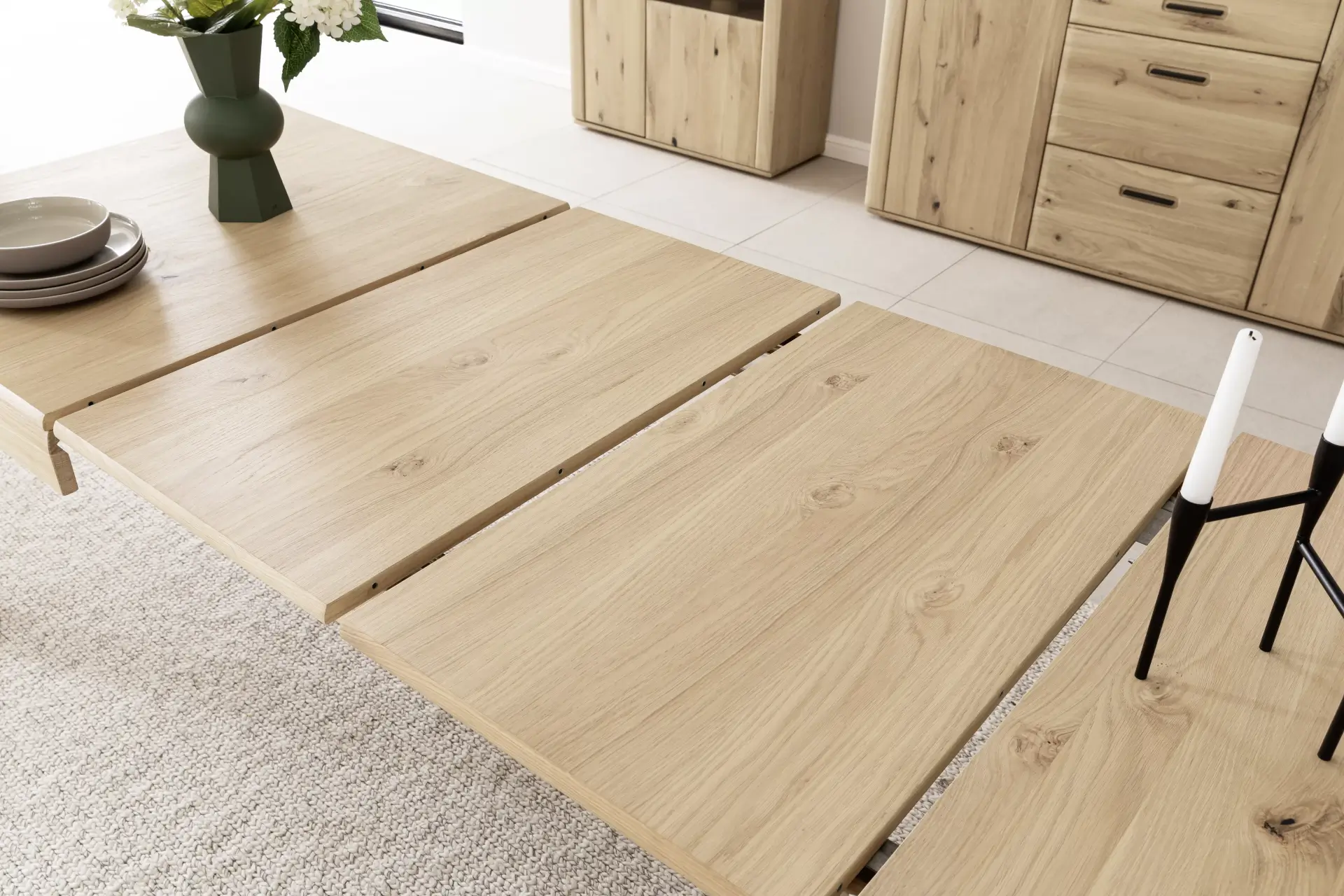 Moderne Wohnwand mit Front in Ast/Balkeneiche massiv mit durchgehender Lamelle in Kristalleiche geölt und einem Korpus In Ast/Balkeneiche furniert. Sichtbare Rückwände in §D Ast/Balkeneiche Nachbildung geschroppt. Ein interessantes Programm, dass zusätzlich einen passenden Couchtisch und ausziehbaren Esstisch beinhaltet.