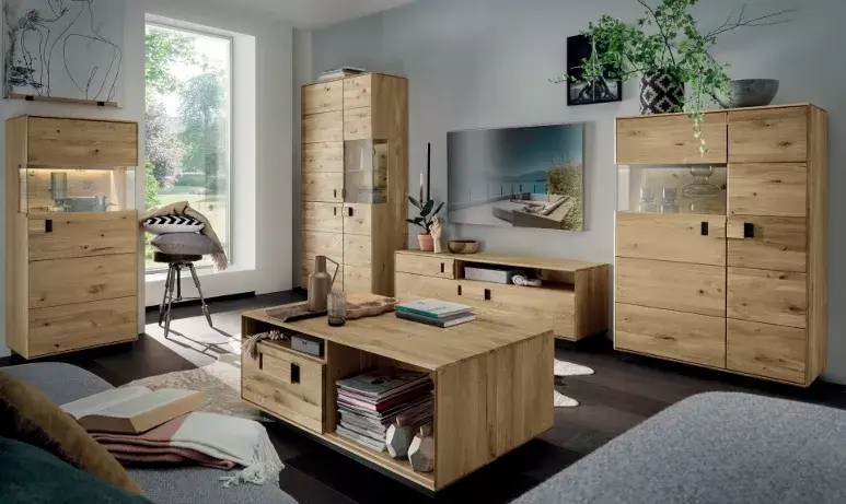 Das Wohnprogramm verbindet ein rustikales Design mit der Moderne. Die geraden Linien in Kombination mit der lebhaften Maserung veredeln Ihr Wohnzimmer und sorgen für ein gemütliches Ambiente. Eiche in ihrer schönsten Form. Die markante Front zusammen mit den Glaseinsätzen bei Sideboard, Highboard und Vitrine, treten besonders ansehnlich in Erscheinung und machen Ihr Wohnzimmer zu einem echten Hingucker. Die Beleuchtung des Sideboards, Highboards und der Vitrine ist optional erhältlich.