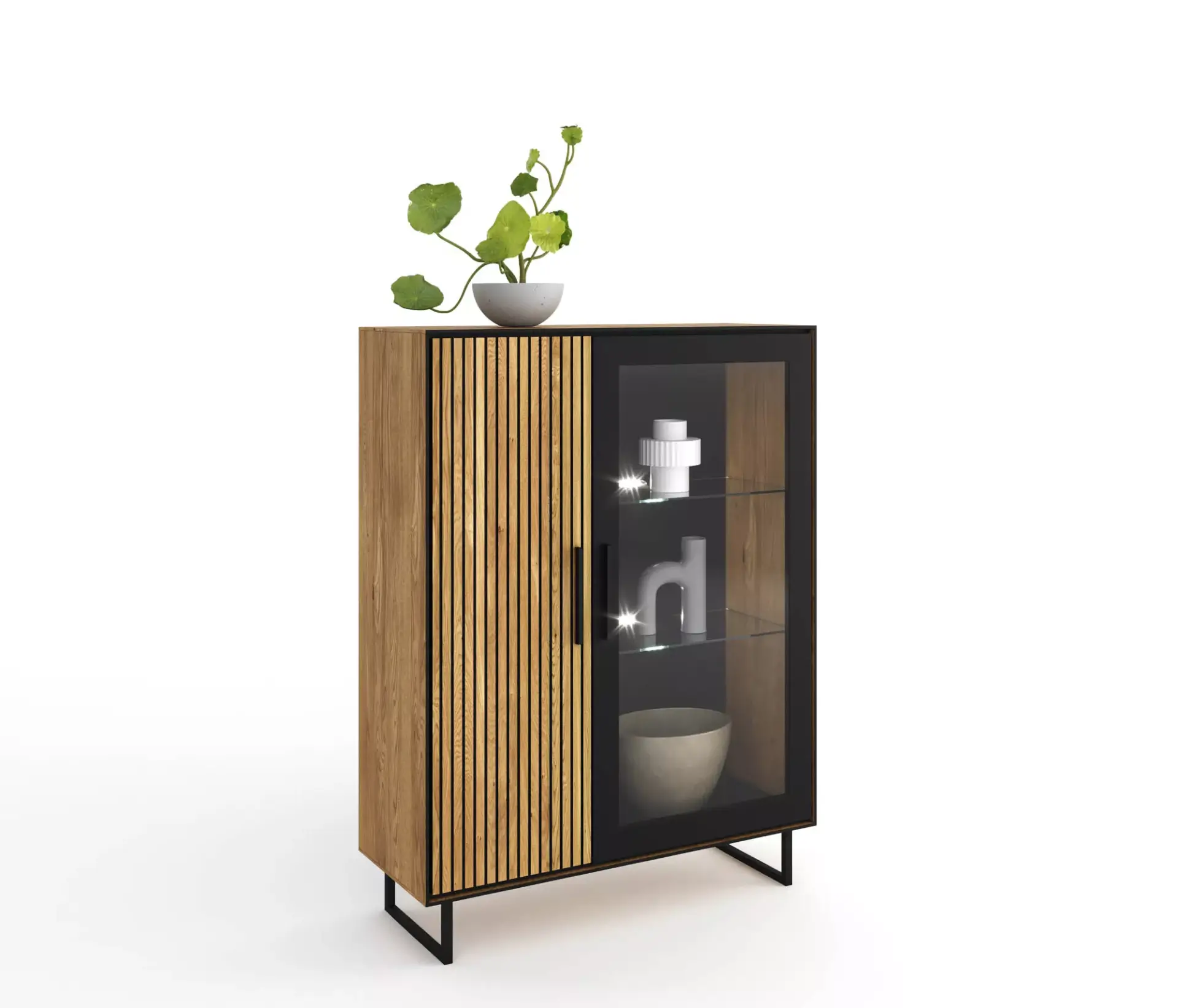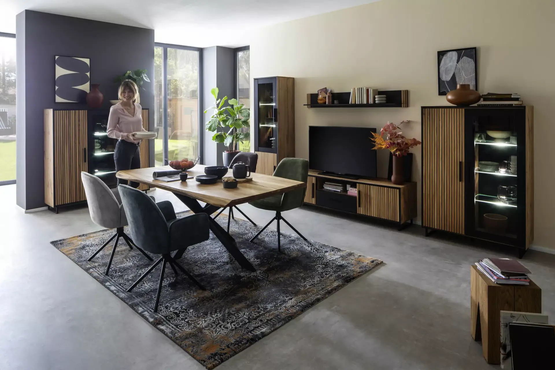 Wohnwandprogramm mit Korpus und Rückwand in Eiche Nachbildung, Fronten Eiche teilmassiv, mit Akustikpaneel, Metallkufen schwarz, bestehend aus:Vitrine, Highboard halbhoch, TV-Element und Wandboard.