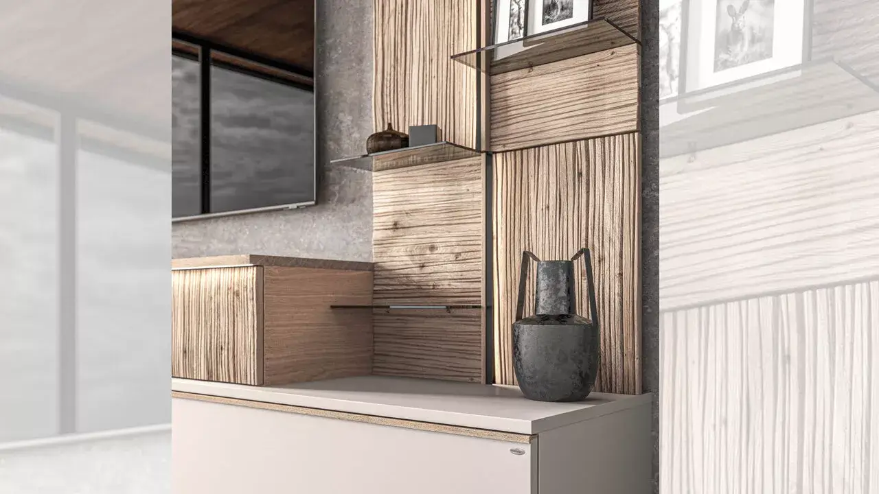 Die Kollektion V/lacera vereint die handwerkliche Präzision von massivem Holz mit der Raffinesse moderner Wasserlack-Oberflächen. Strukturierte Massivholz-Reliefs, die durch gekonnte Beleuchtung in Szene gesetzt werden, treffen auf schlichte, klare Formen. Eine Kollektion, die das Zusammenspiel von Design und Handwerkskunst auf das nächste Level hebt.