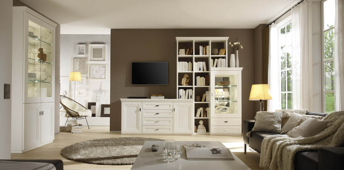Kent ist ein Klassiker im Einzel- und Systemmöbelprogramm und natürlich made in Germany. Hochwertige Oberflächen in Lack weiss und cognac antik.